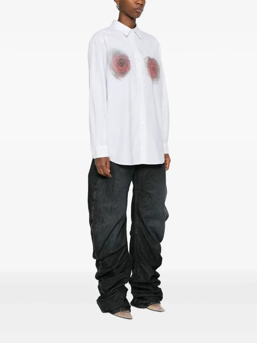 Белый длинные рукава застежка на пуговицы классический воротник принт с розами эффект размытия