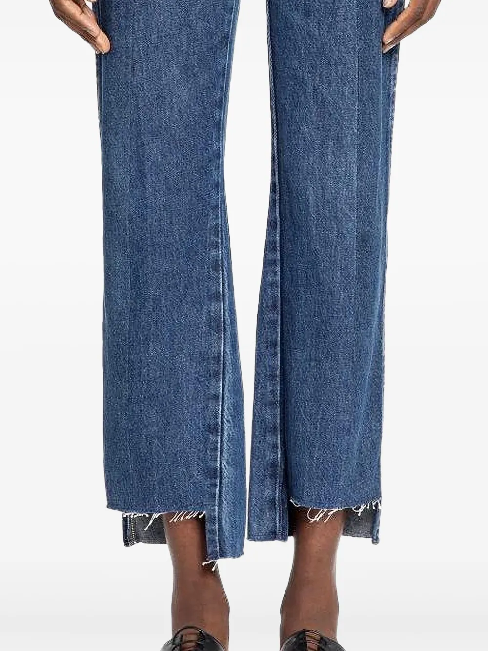 Синий хлопок, центральная панель, боковые панели, необработанный край низа, высокая талия