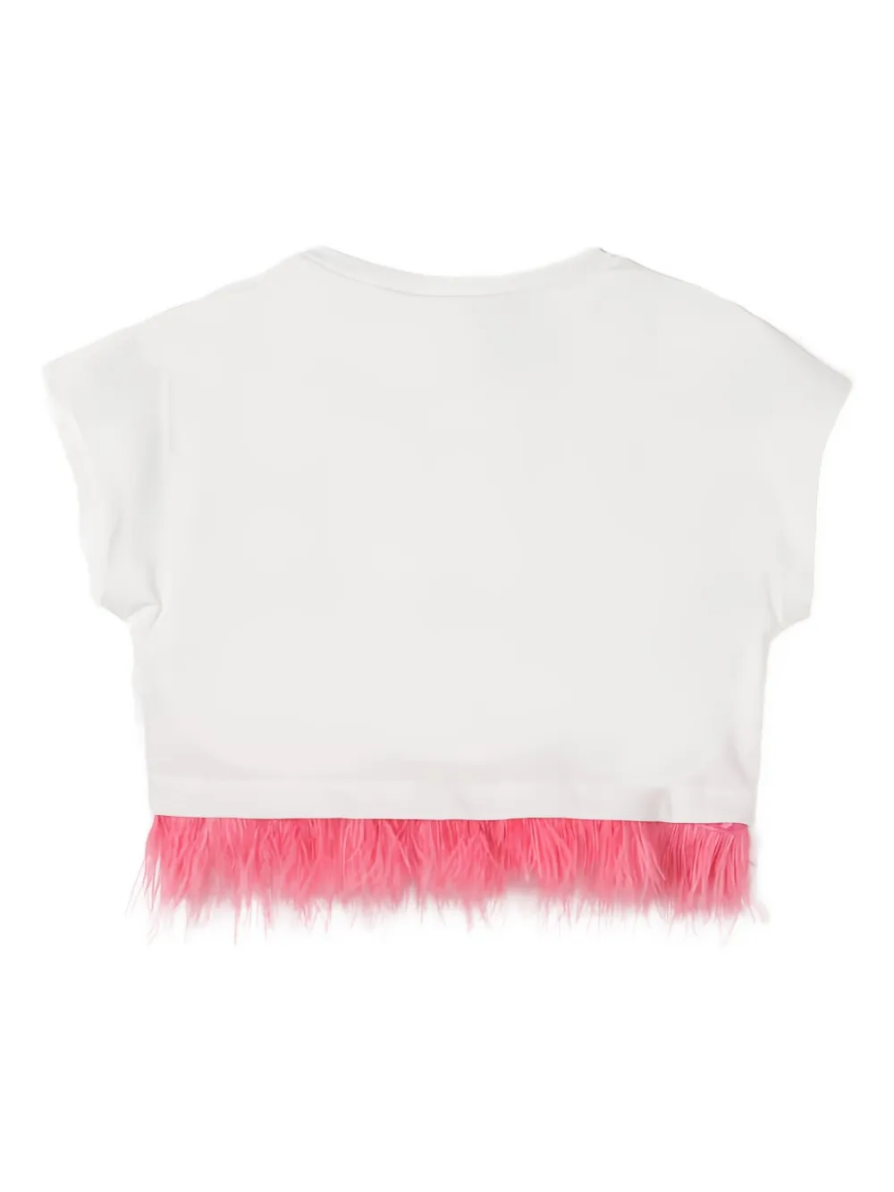Белый короткие рукава круглый вырез укороченная длина отделка перьями