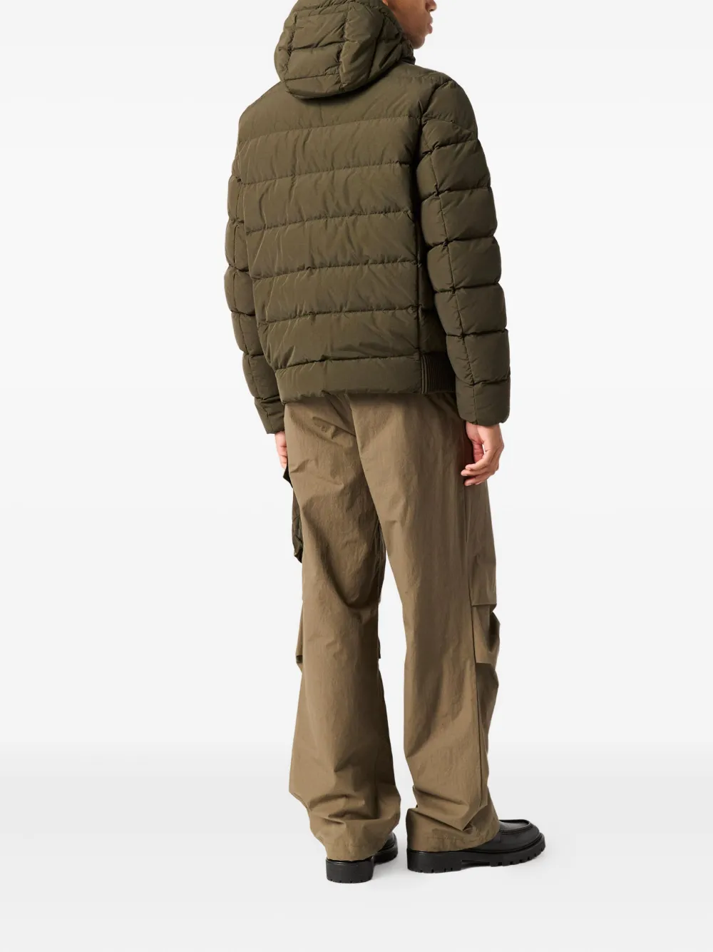 Оливково-зеленый цвет, стеганный дизайн, капюшон, застежка-молния, длинные рукава, прямой низ