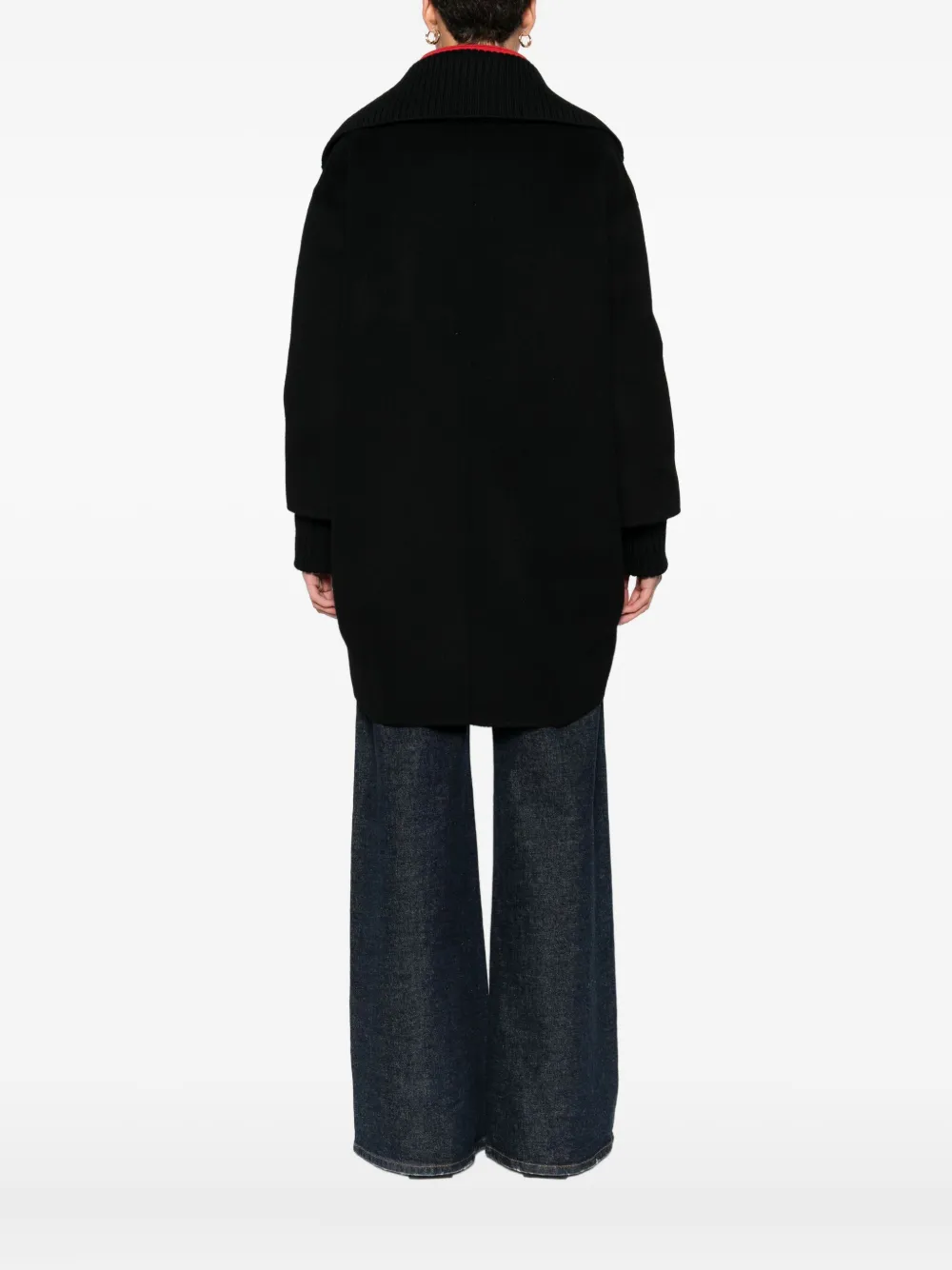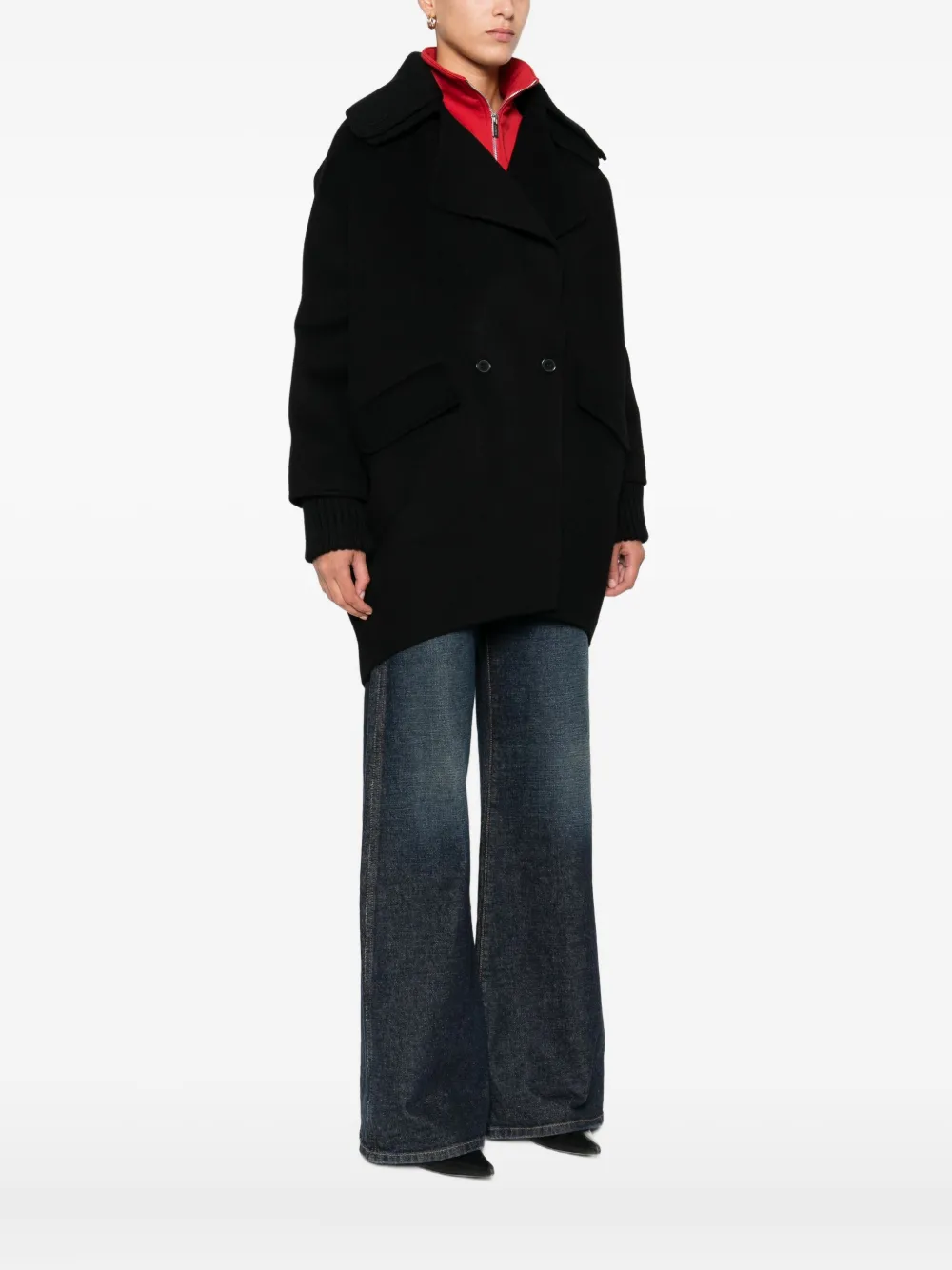 Черный двубортный с клапанами на карманах, изогнутым подолом и длинными рукавами