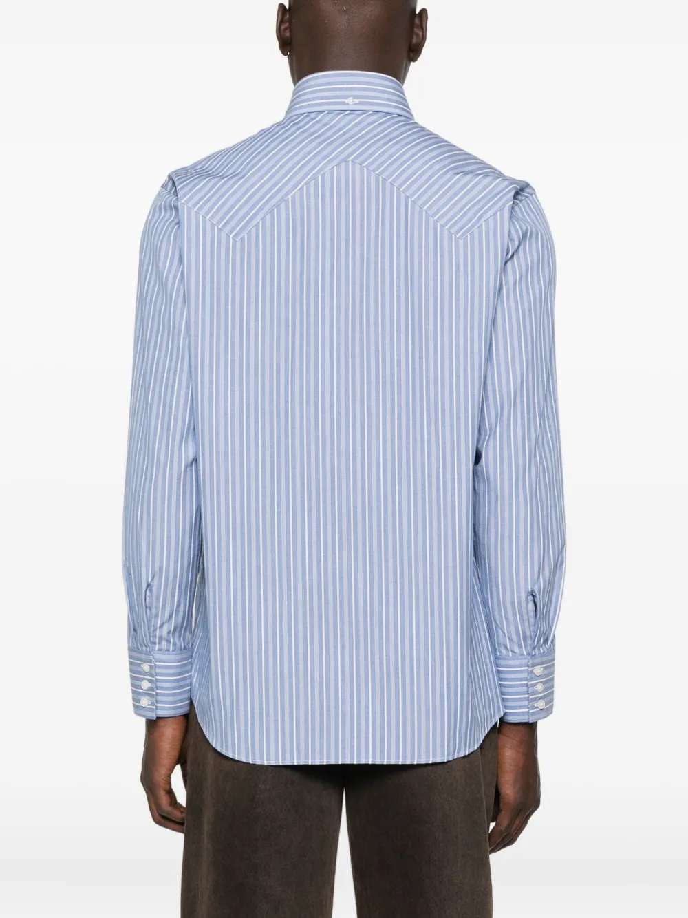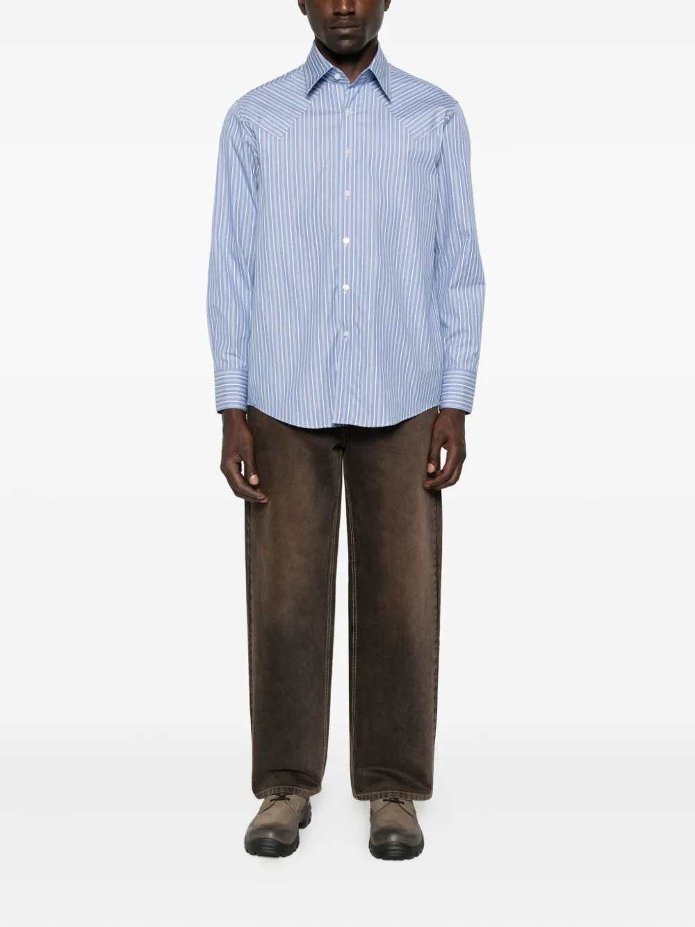 Синийв полоскузастежка на пуговицы спередидлинные рукаваострый воротник