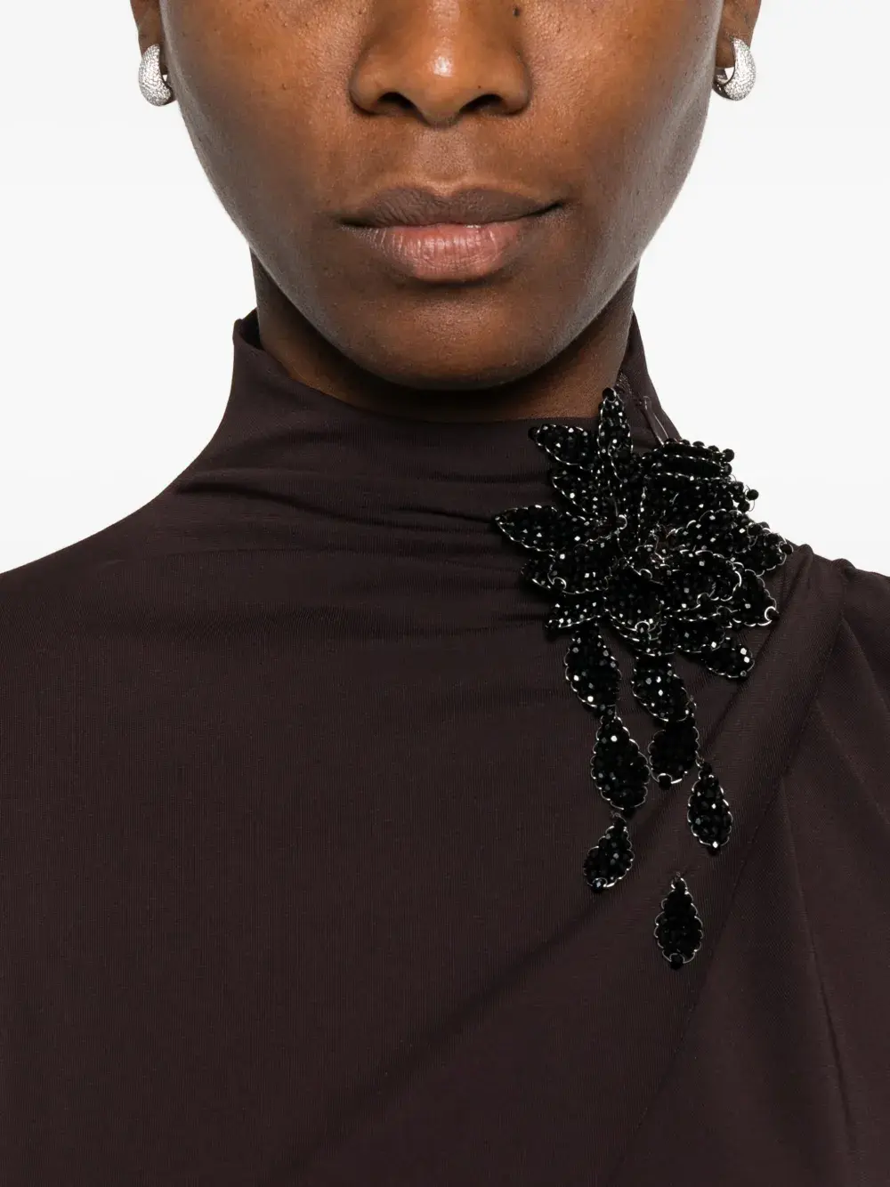 Коричневого цвета высокий воротник асимметричный подол длинные рукава