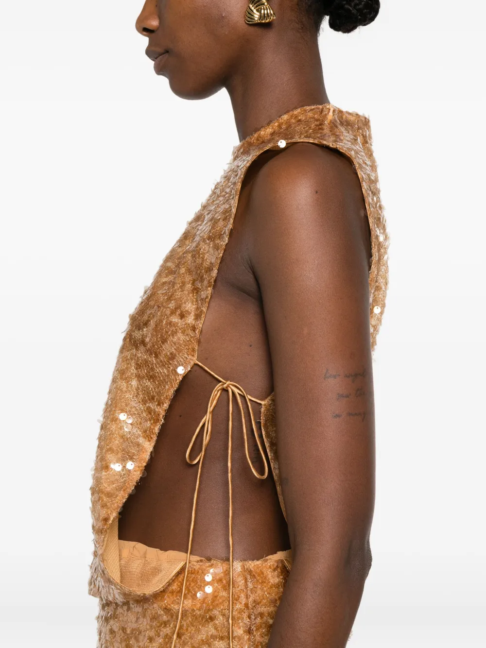 Янтарно-желтый декор из пайеток без рукавов круглый вырез застежка-завязка сбоку