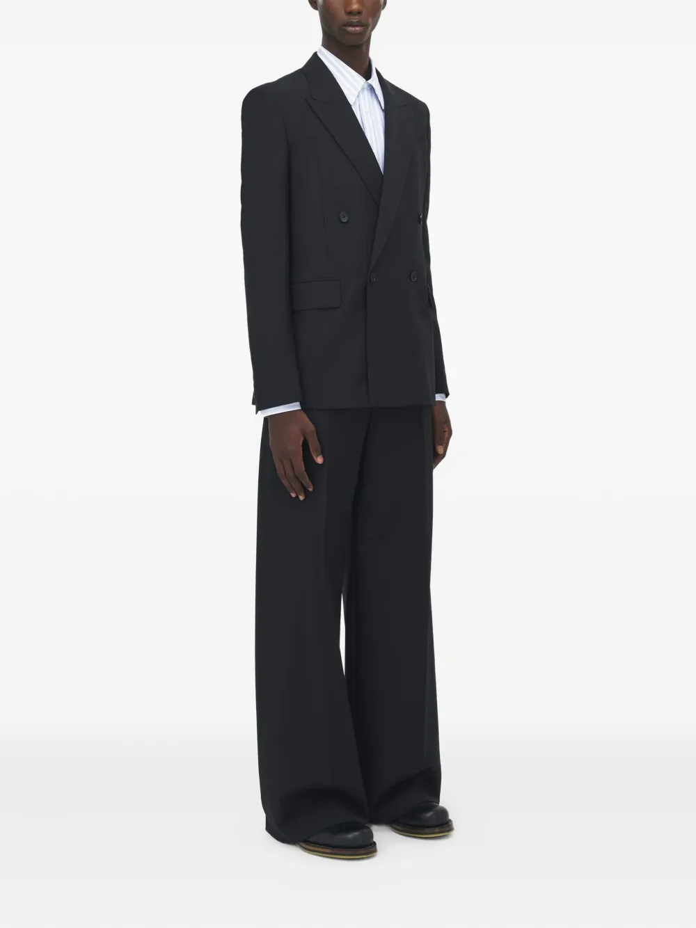 Черный двубортный застежка, лацканы с острыми концами, цепочка на спинке, длинные рукава, прямой подол