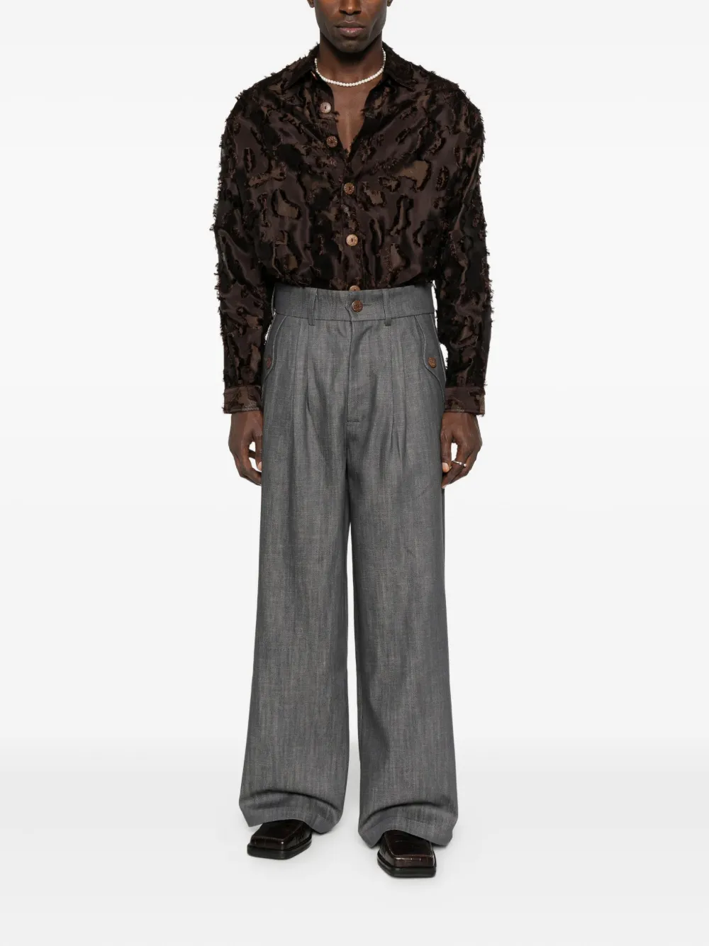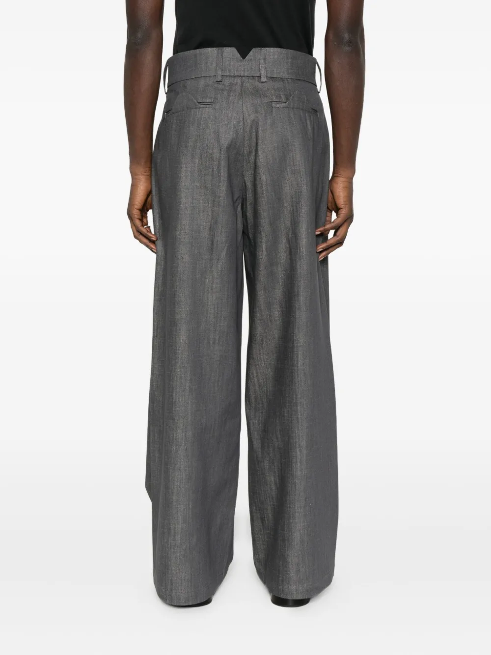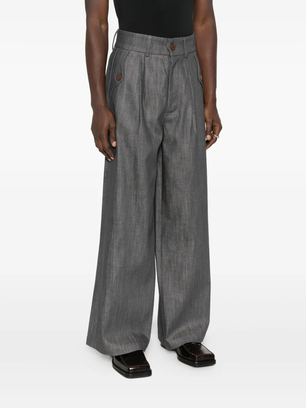 Серые брюки со складками спереди, застежкой на пуговицы, боковыми карманами, клапанами на карманах и прямыми штанинами