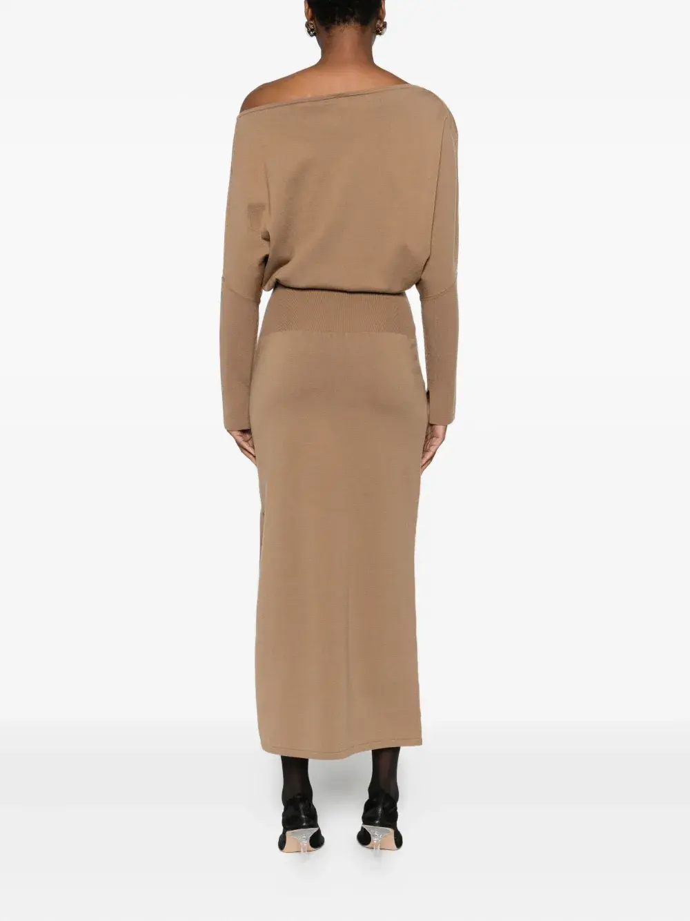 Верблюжий коричневый с открытыми плечами длинные рукава средняя длина эластичная талия