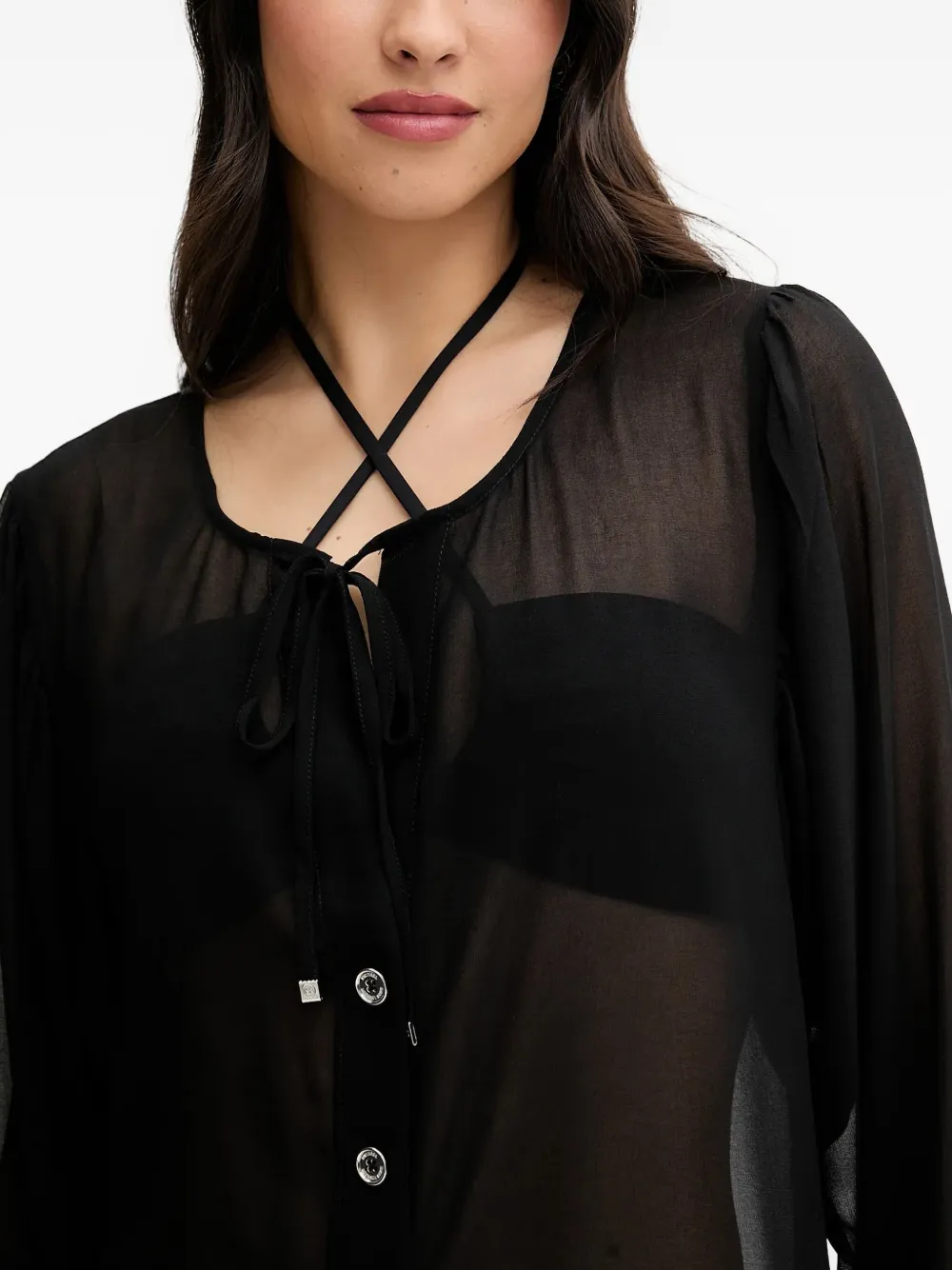 Черная кофта с застежкой на пуговицы спереди, завязками, длинными рукавами, полупрозрачной отделкой и круглым вырезом