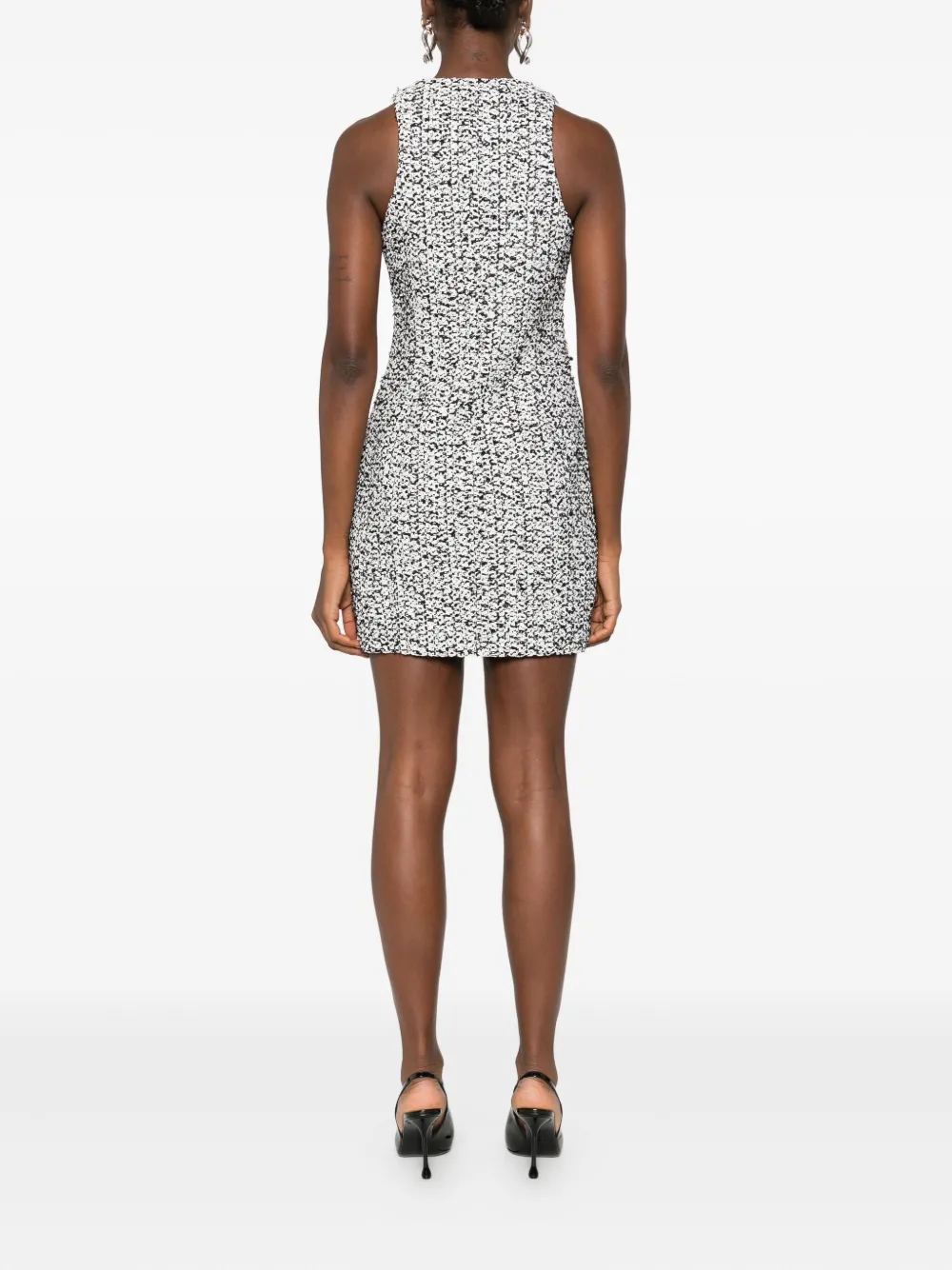Белый и черный твид, текстурированный, с воротником-халтер, застежка-молния спереди, без рукавов, короткая длина
