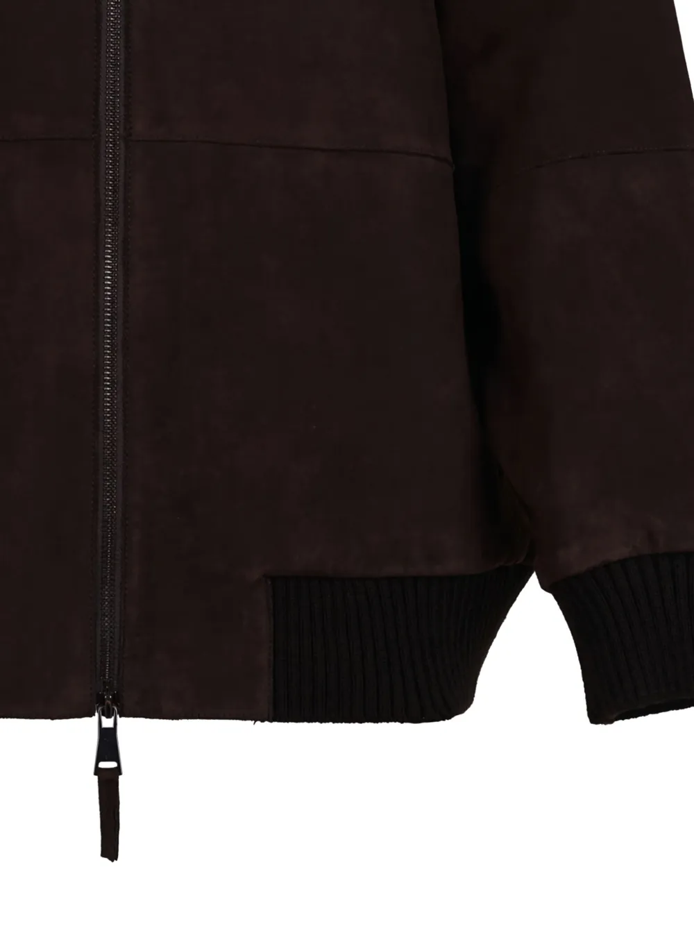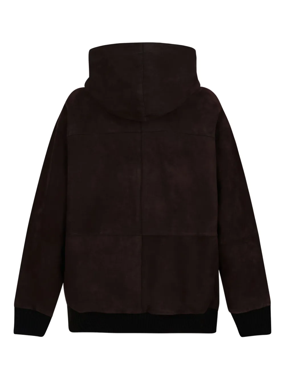 Темно-коричневый цвет, ребристая кромка, застежка на молнию, капюшон на завязках, длинные рукава