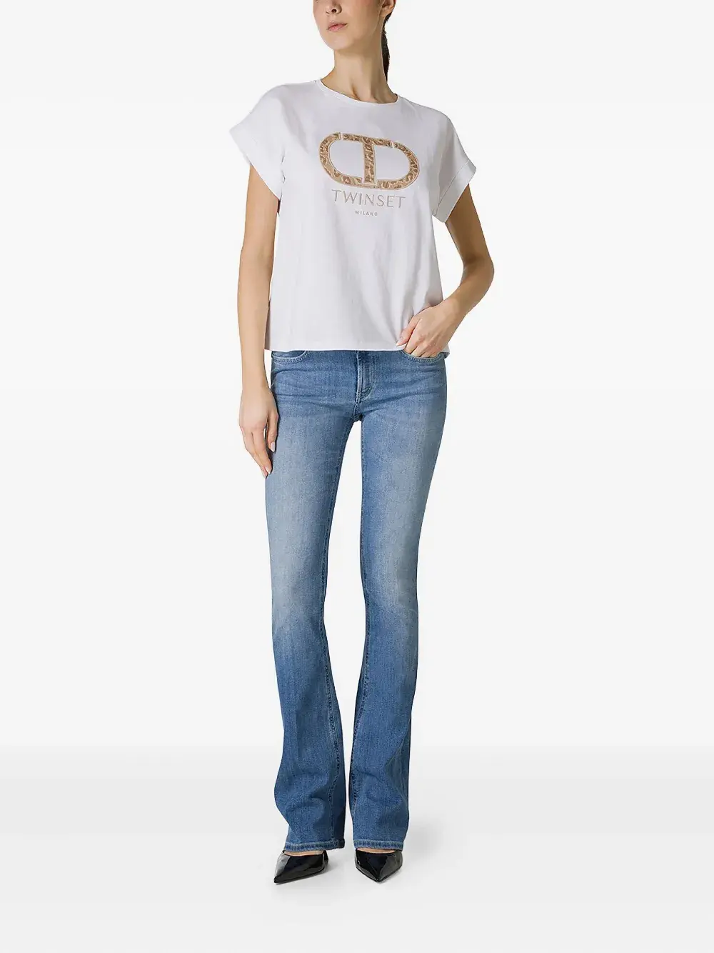 Белая футболка с леопардовым принтом, логотипом, короткими рукавами и круглым вырезом