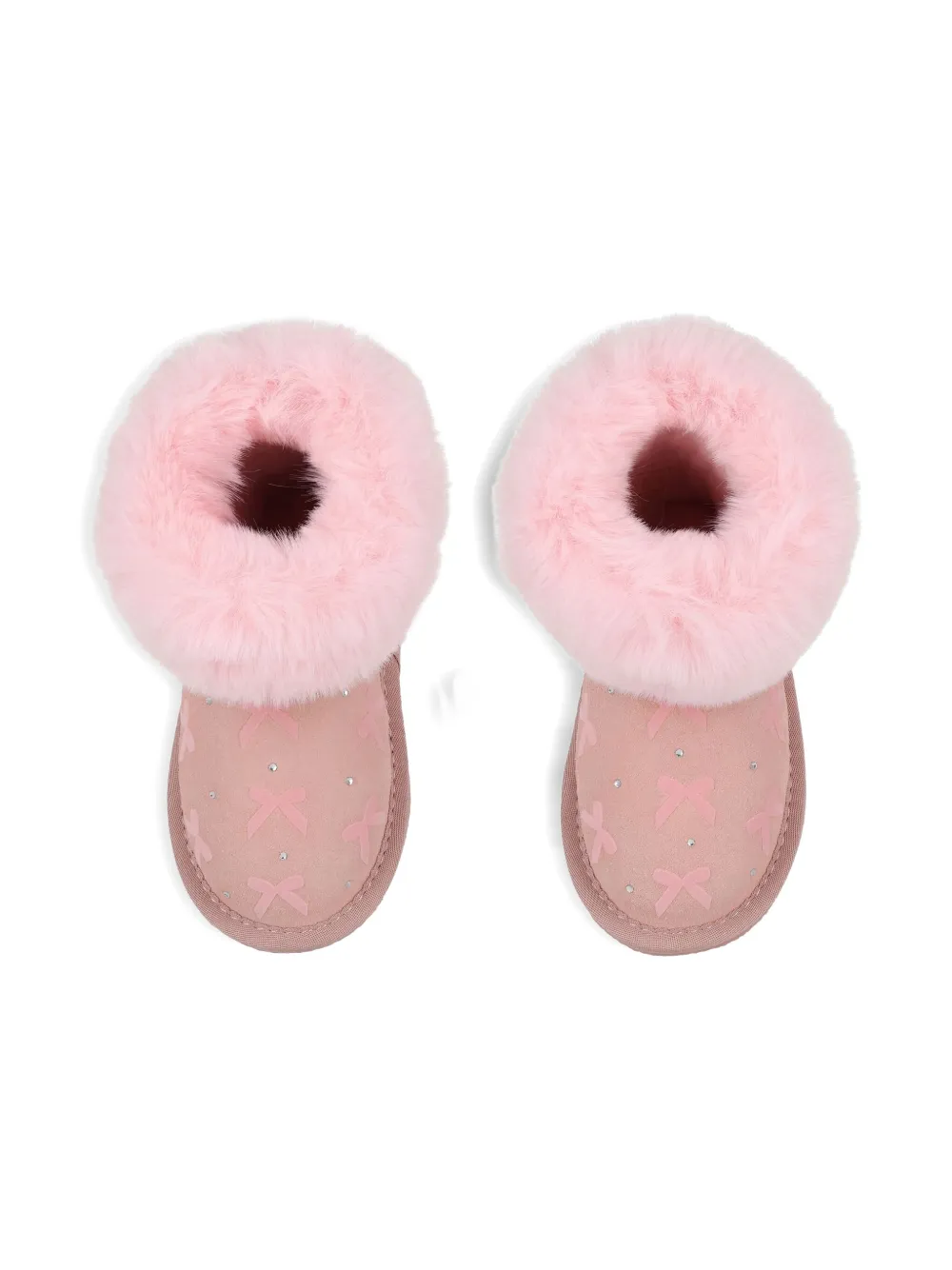 Розовые замшевые туфли с отделкой из искусственного меха, бантом, украшением стразами и плоской подошвой