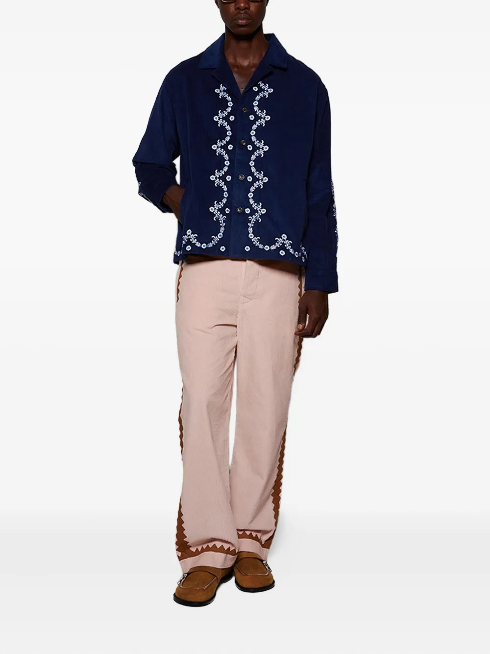 Синий хлопок вельветовая фактура цветочная вышивка застежка на пуговицы длинный рукав