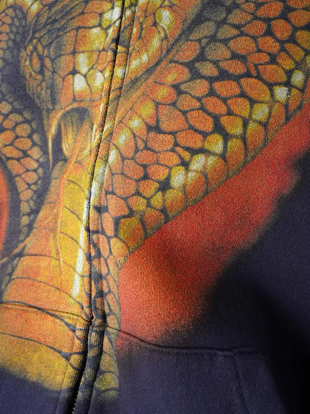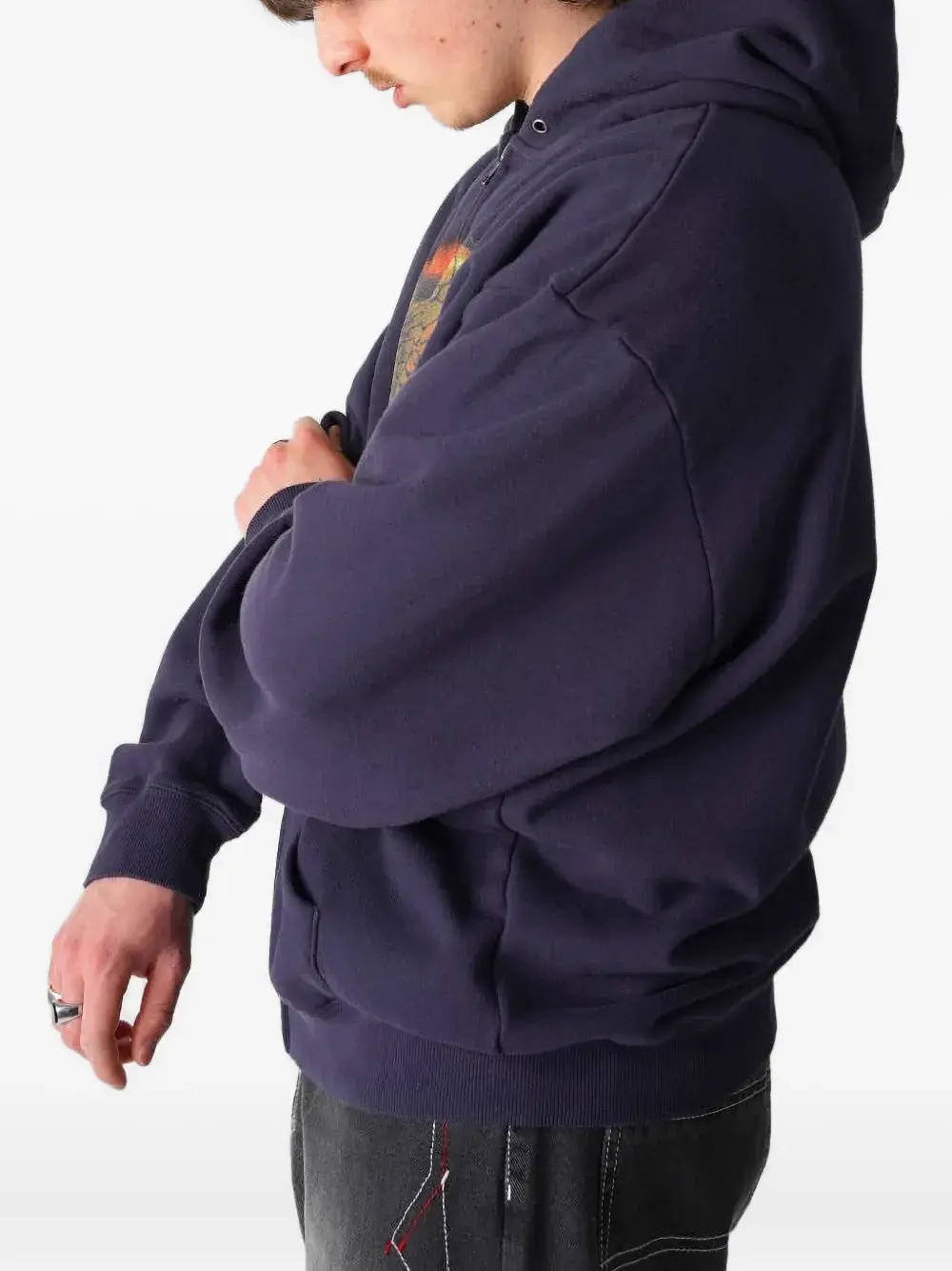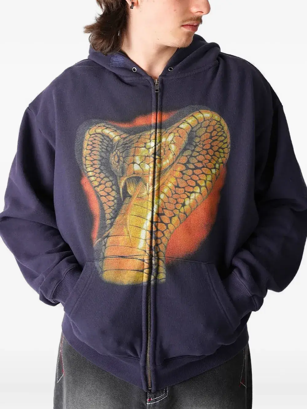Темно-синий графический принт застежка-молния капюшон карман-кенгуру