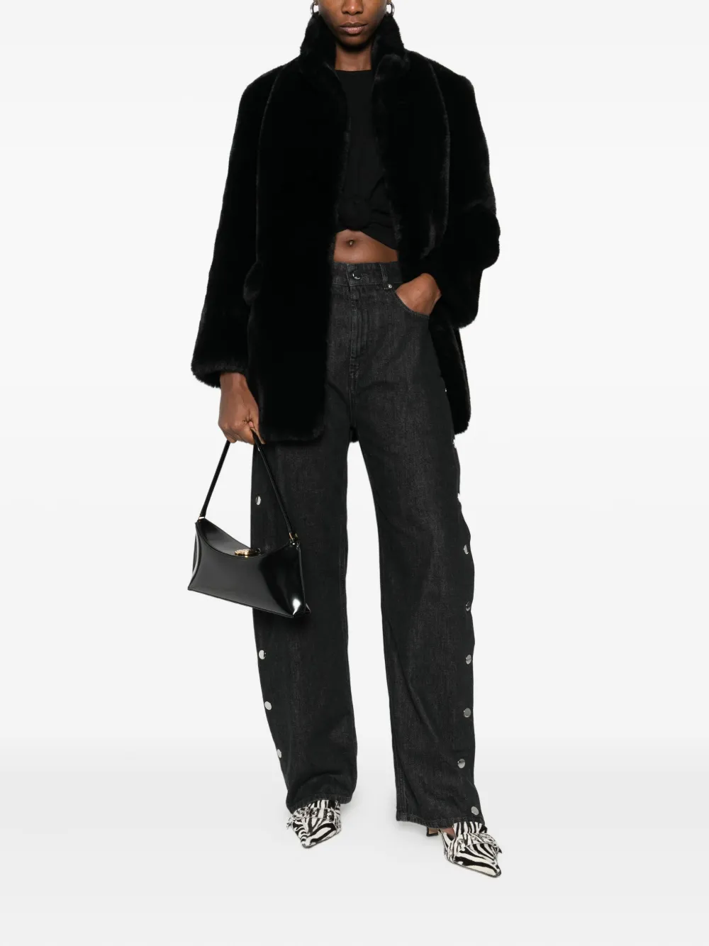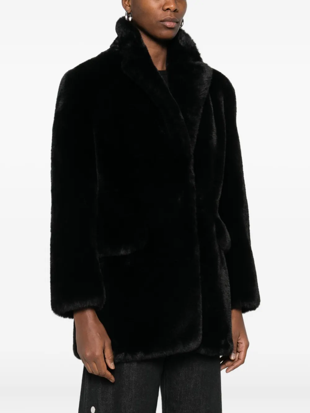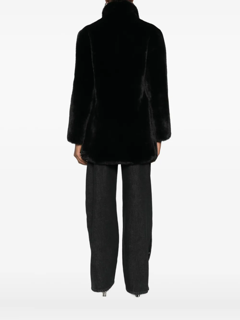 Черная искусственная меховая куртка с высоким воротником, накладными карманами, скрытой застежкой и длинными рукавами