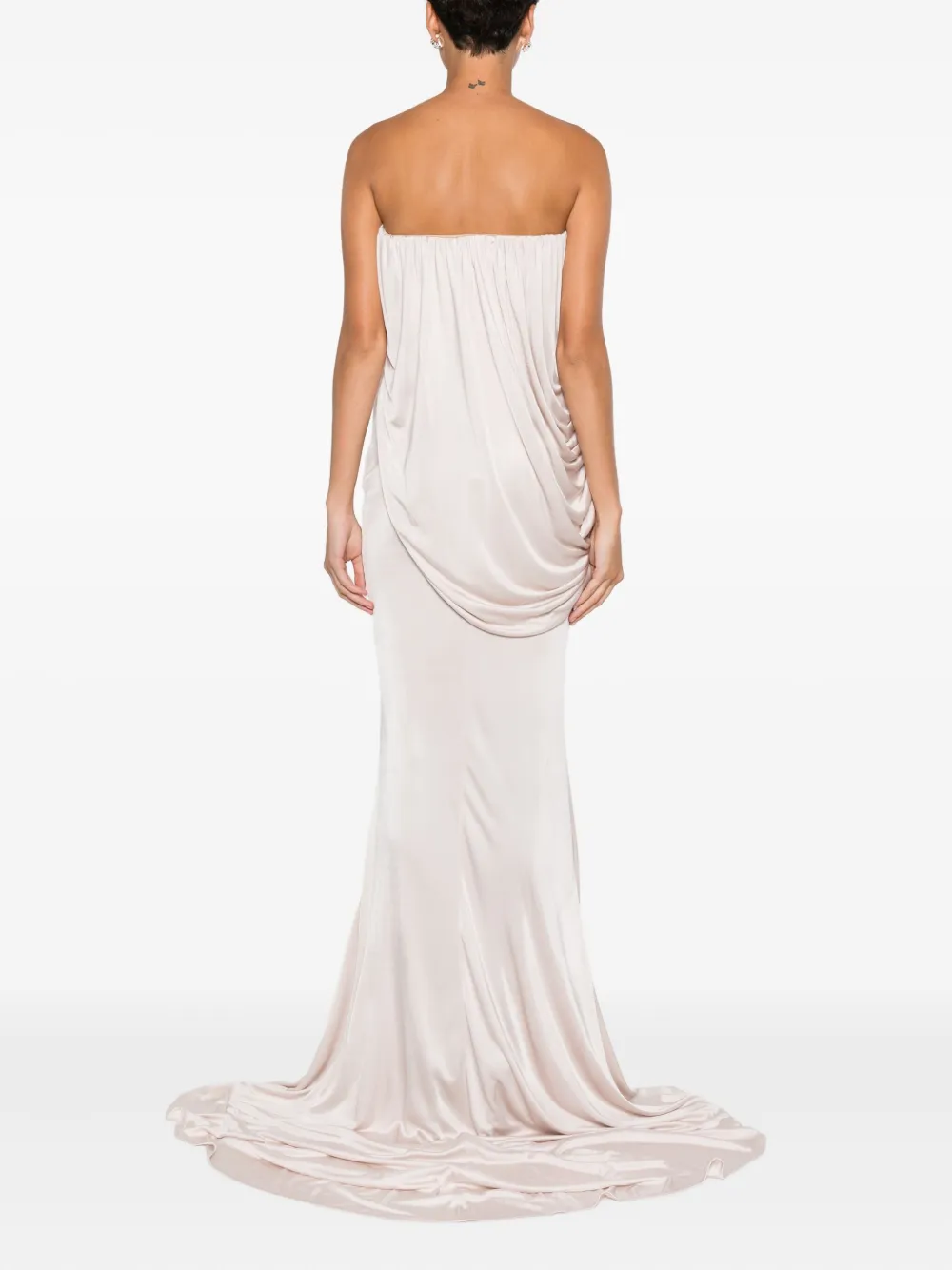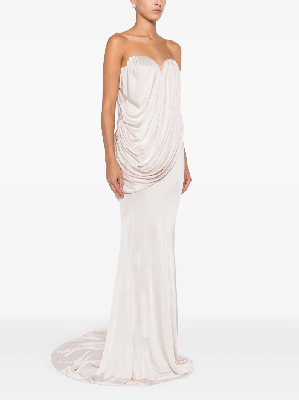 Платье цвета нежно-розовый, с драпированным лифом в виде водопада, без бретелек, в пол, с юбкой силуэта "русалка"