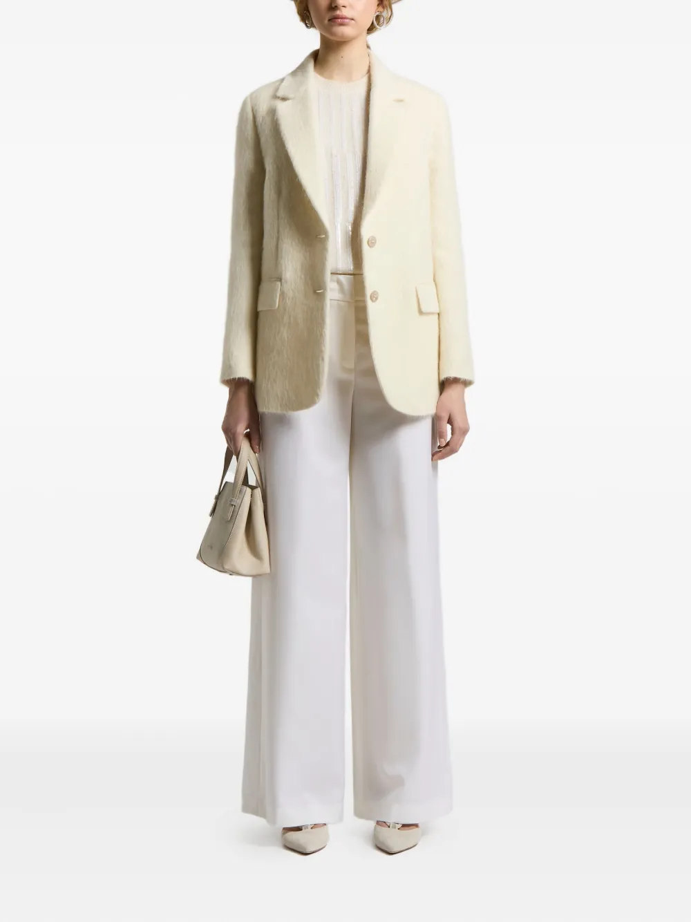 Цвет экрю текстура с ворсом однобортная застежка отложной лацкан накладные карманы с клапанами длинные рукава