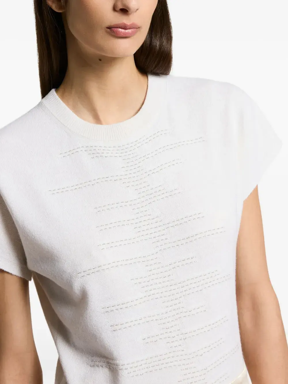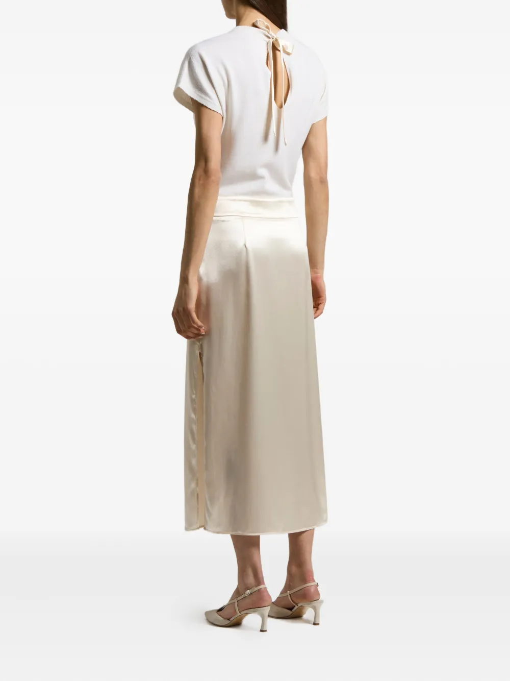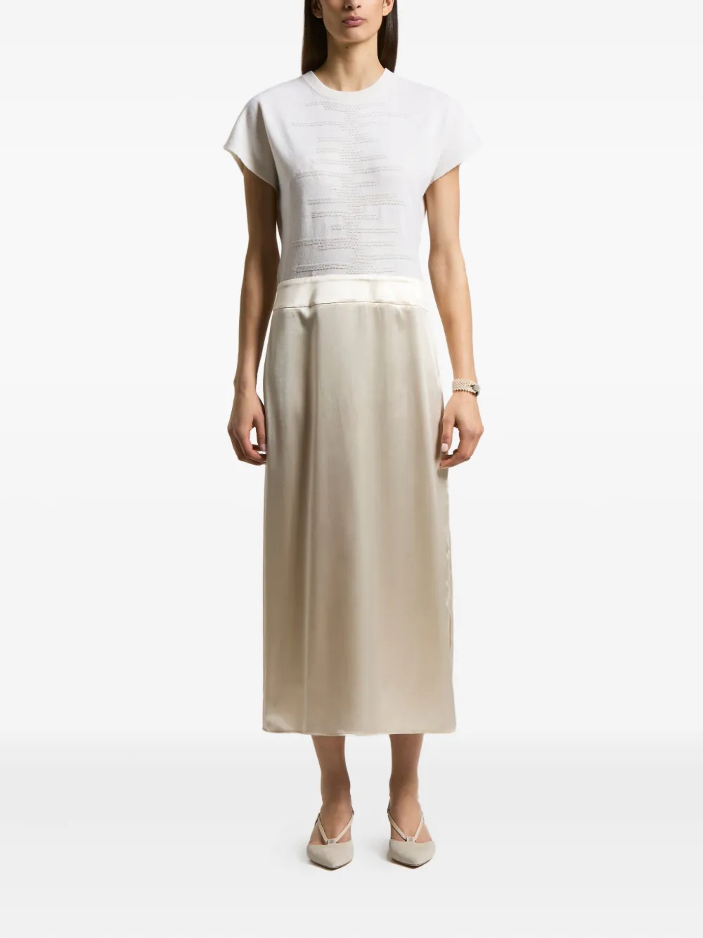 Белая атласная миди-юбка короткие рукава вышитые детали круглый вырез боковой разрез