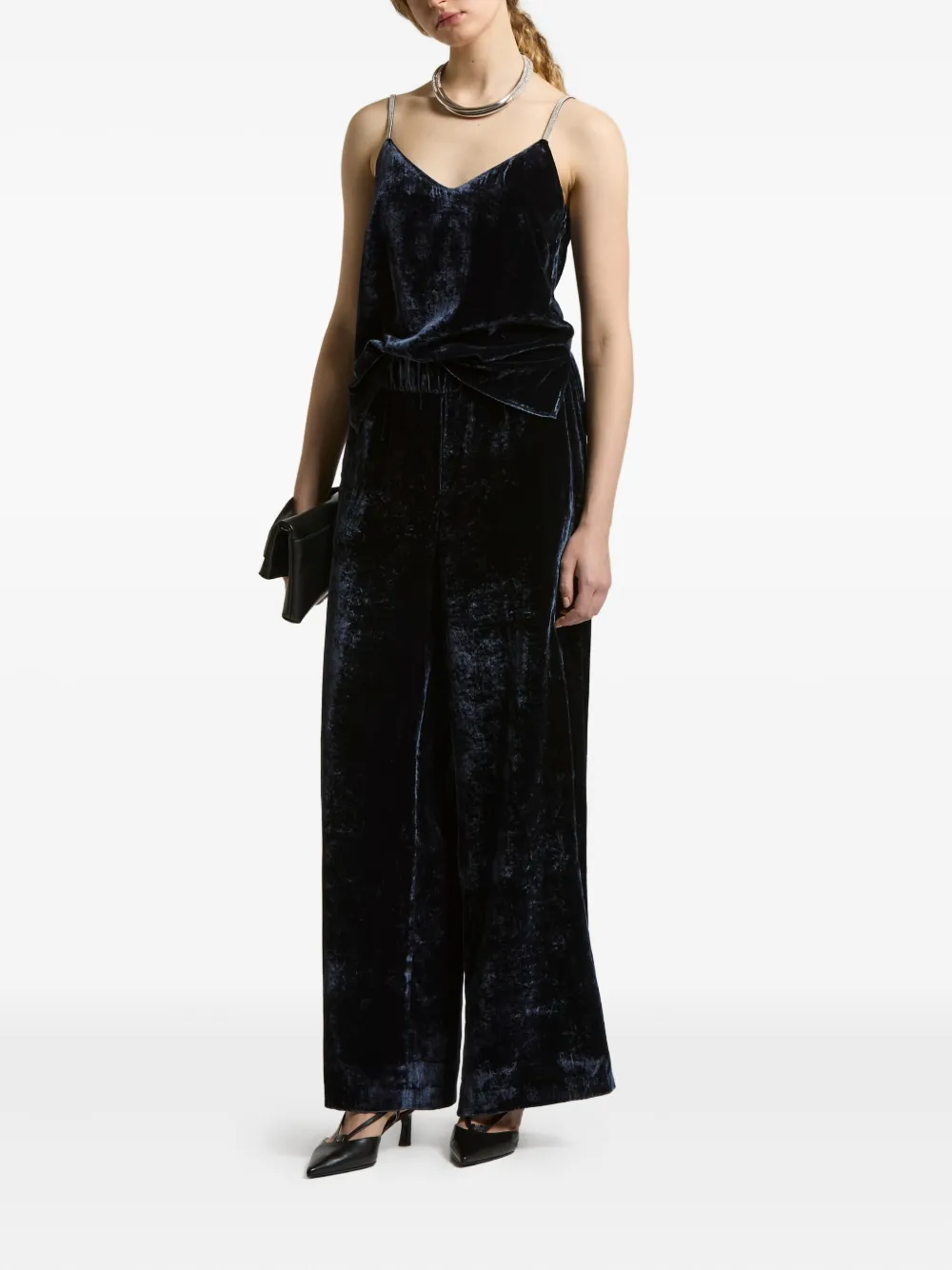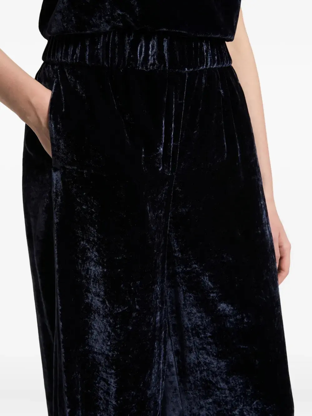 Темно-синий бархатный материал, широкий крой, эластичный пояс, боковые карманы, прямой низ