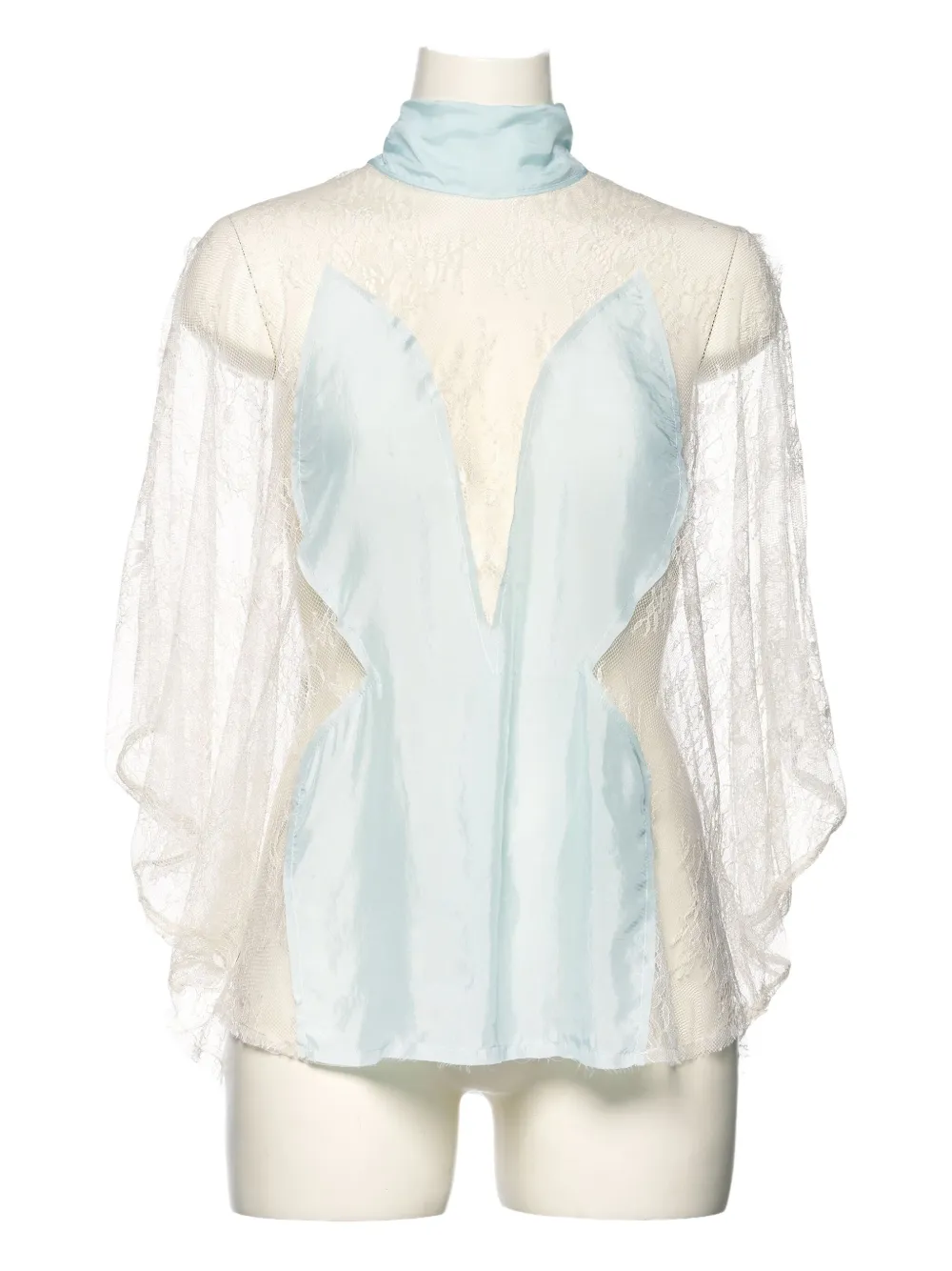 Светло-голубой кружевная отделка деталь в виде банта высокий ворот прозрачные рукава вставка с V-образным вырезом
