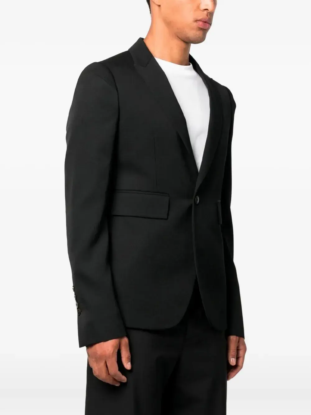 Черный однобортный пиджак с застежкой на пуговицы, клапанами на карманах и манжетами на пуговицах