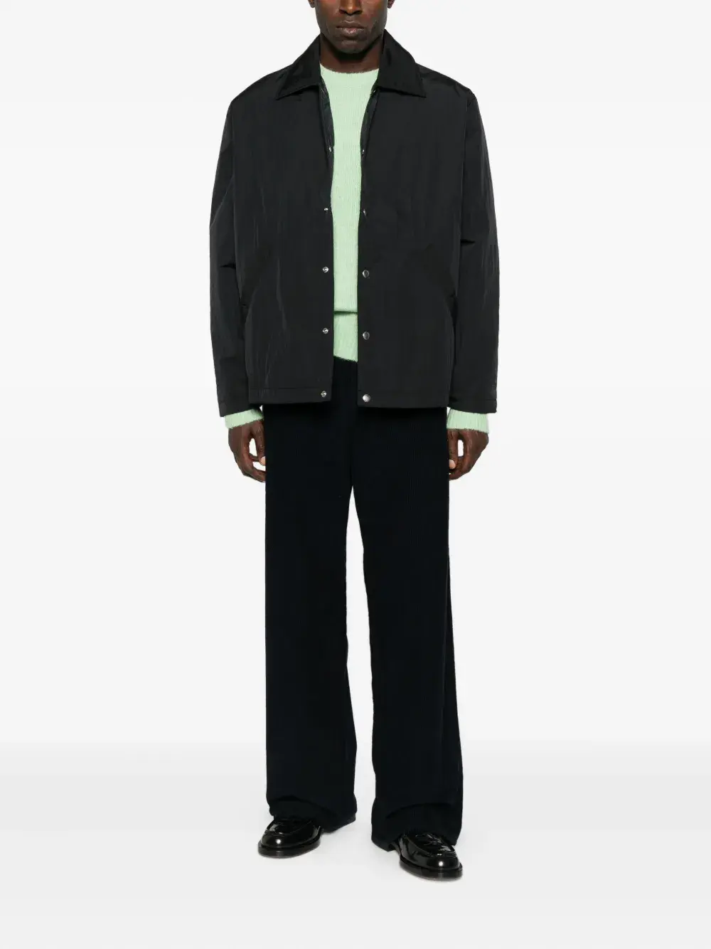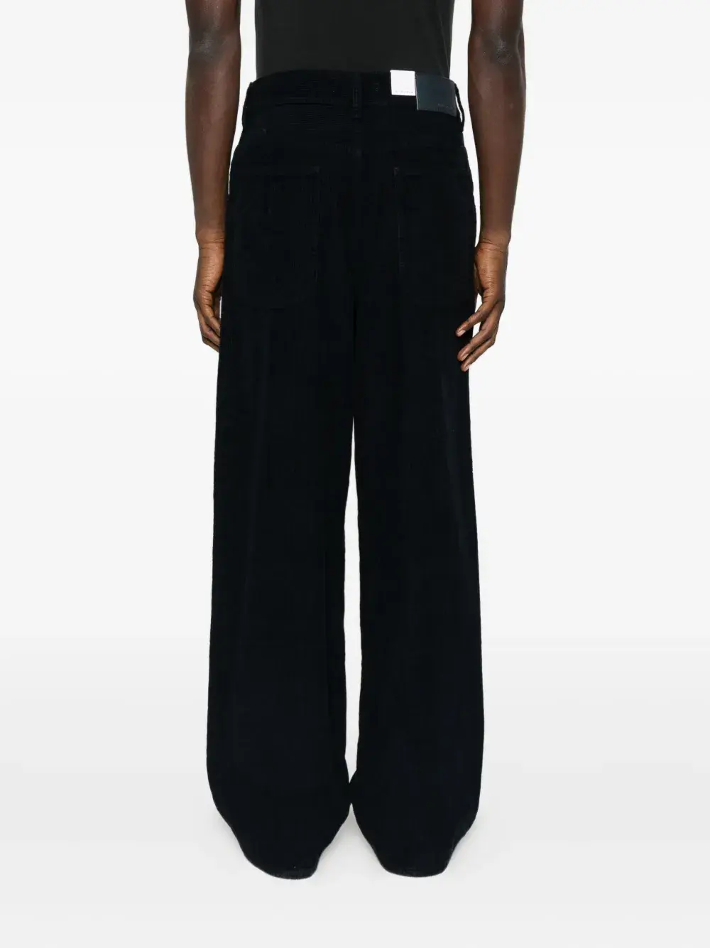 Темно-синий вельветовый материал, пять карманов, застежка на пуговицах, прямой край