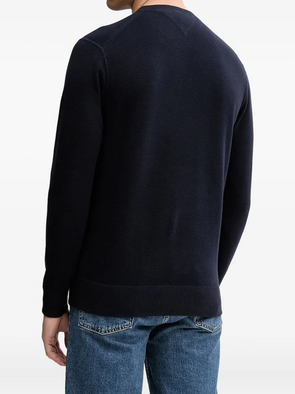 Темно-синего цвета, круглый вырез, длинные рукава, принт с логотипом спереди, прямой подол
