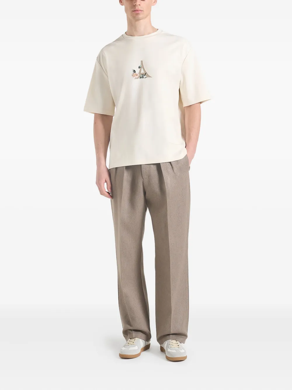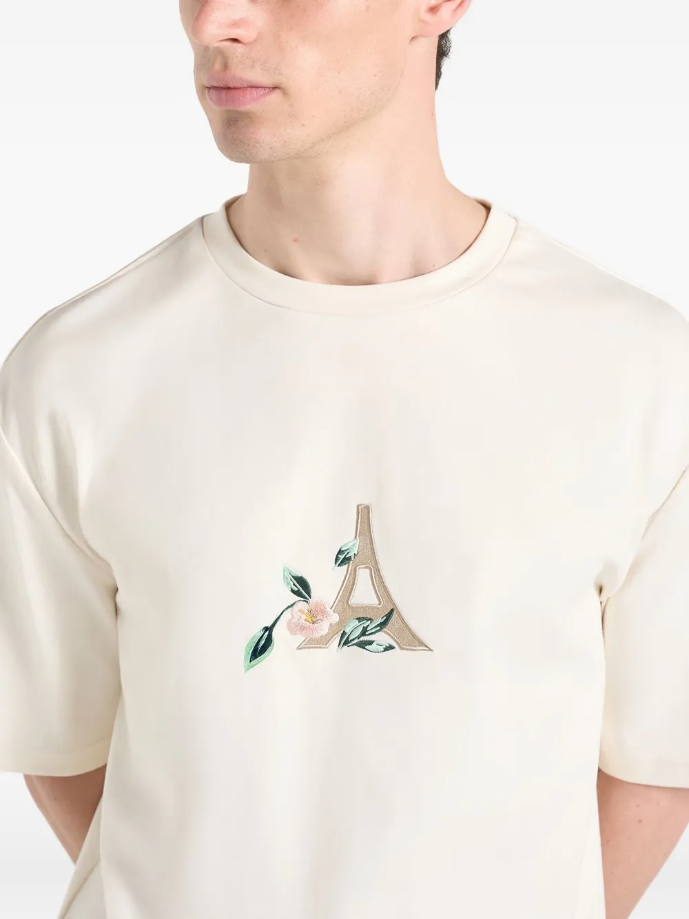 Кремовый цвет, вышивка с логотипом, цветочная вышивка, вязаный круглый вырез, короткие рукава, прямой подол