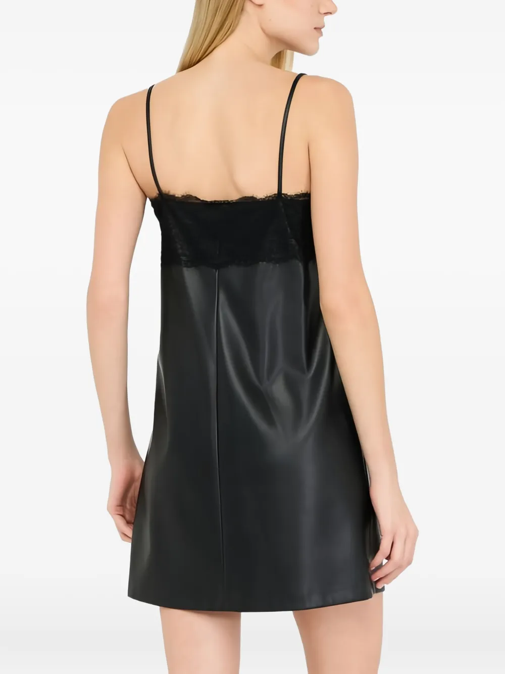 Черное платье с кружевной отделкой, V-образным вырезом, бретелями на плечах, разрезом на подоле и эффектом покрытия
