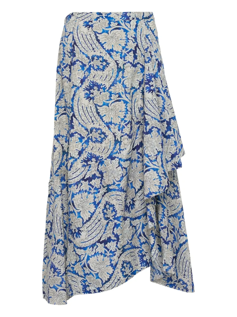 Синее платье миди с принтом "пейсли", воланами, асимметричным подолом, запахом и высокой талией