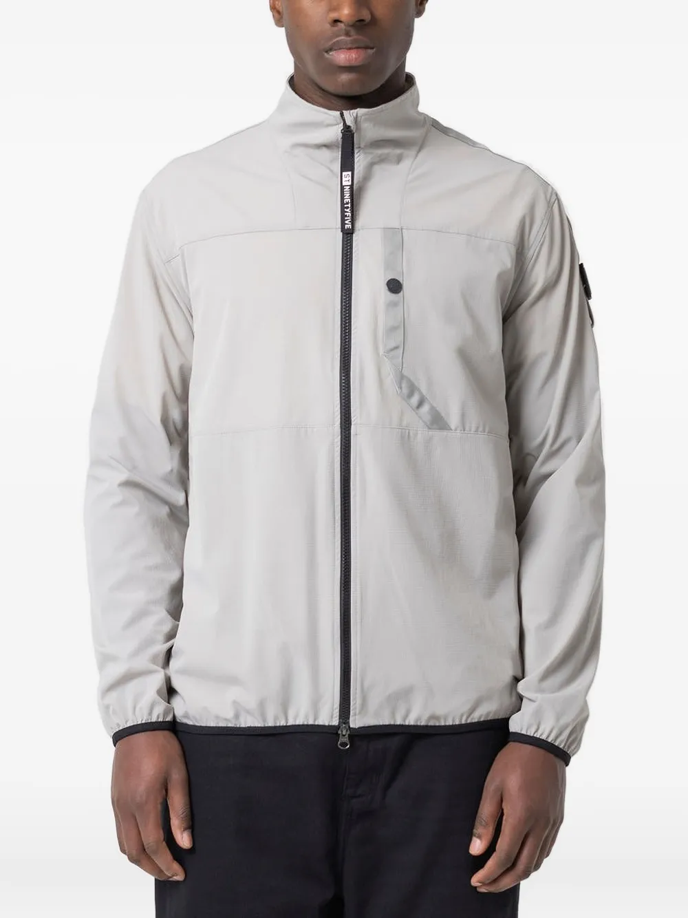 Светло-серый цвет, застежка-молния, высокий воротник, нашивка с логотипом, длинные рукава, эластичный низ