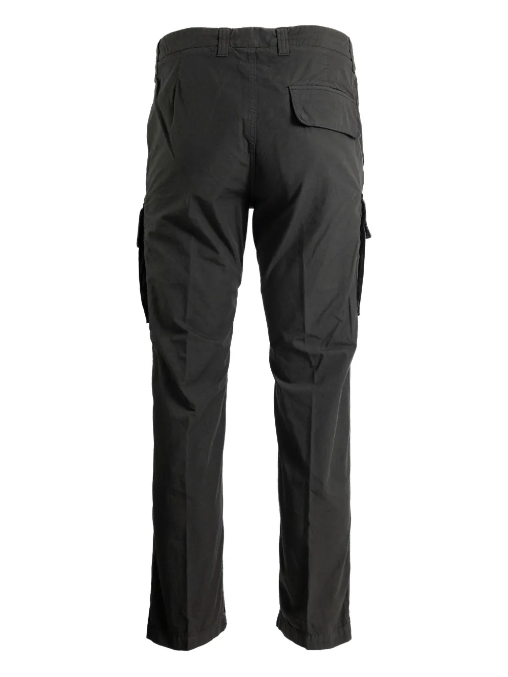 Серые брюки с несколькими накладными карманами, застежкой на пуговицы и молнией