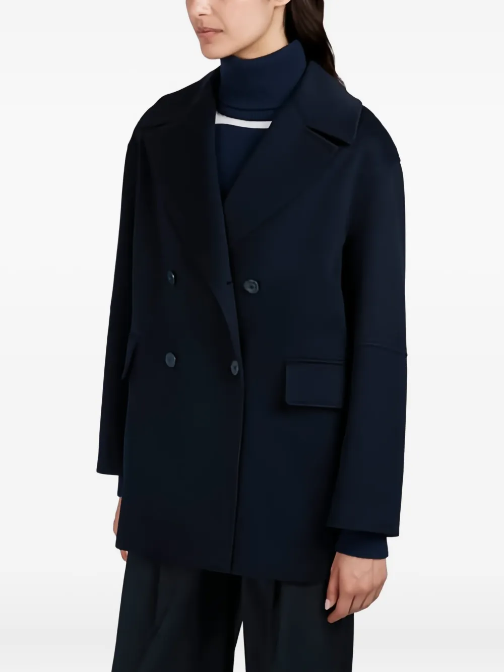 Синий кашемир двубортная застежка на пуговицы карманы с клапанами заниженная линия плеч длинные рукава