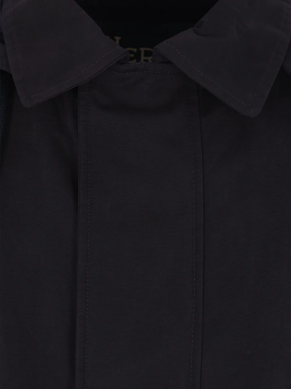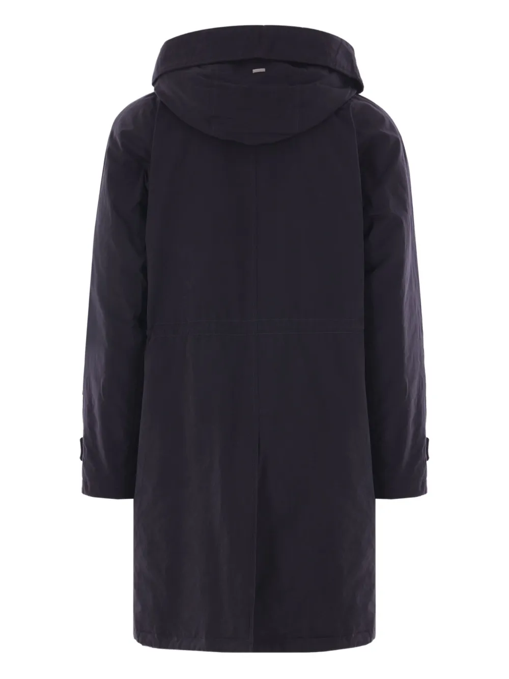 Темно-синий наполнитель из пуха капюшон на кулиске накладные карманы с клапанами застежка спереди с потайной планкой