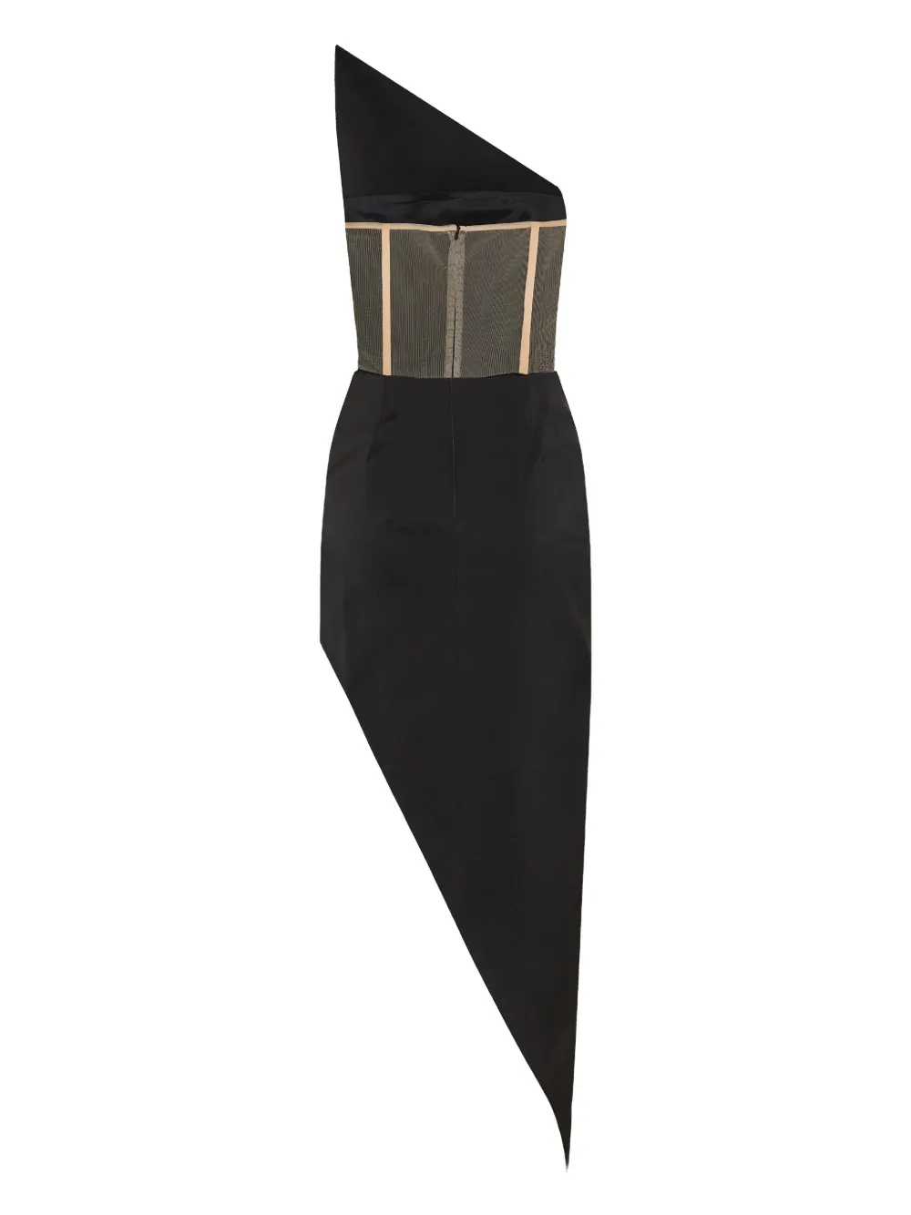 Черный топ с асимметричным вырезом на одно плечо, асимметричным низом, облегающим лифом, открытой молнией сзади и деталями на спинке