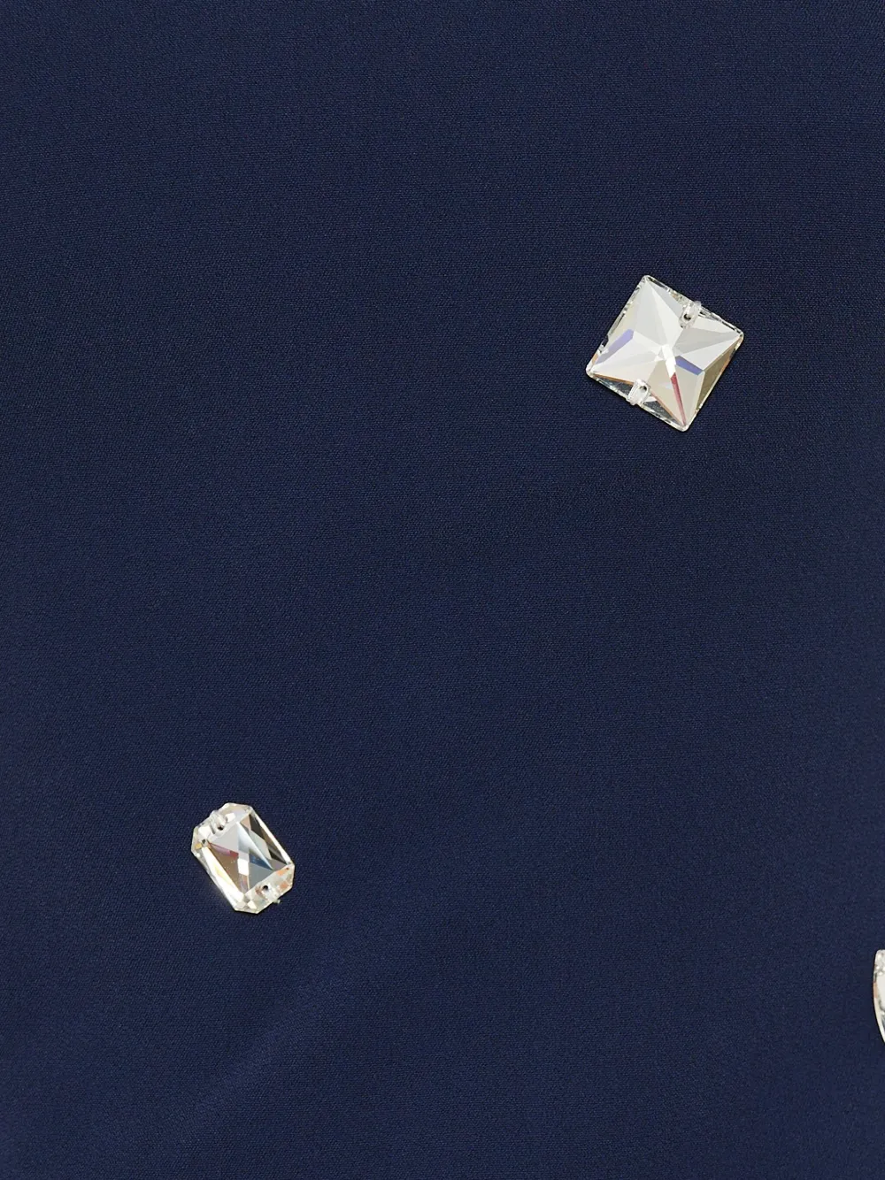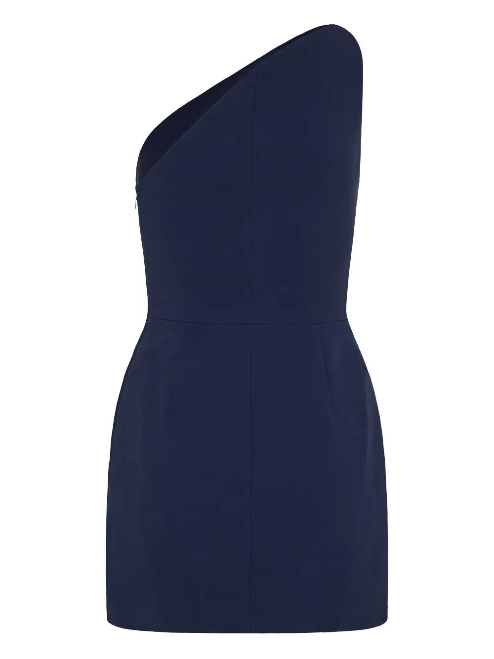 Темно-синее платье с одним открытым плечом, украшением из кристаллов, асимметричным подолом, боковой застежкой-молнией и прилегающим лифом