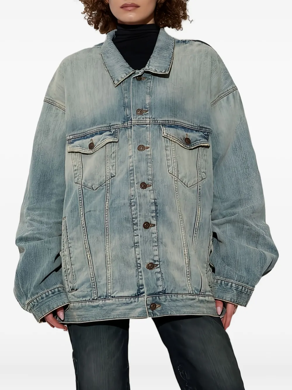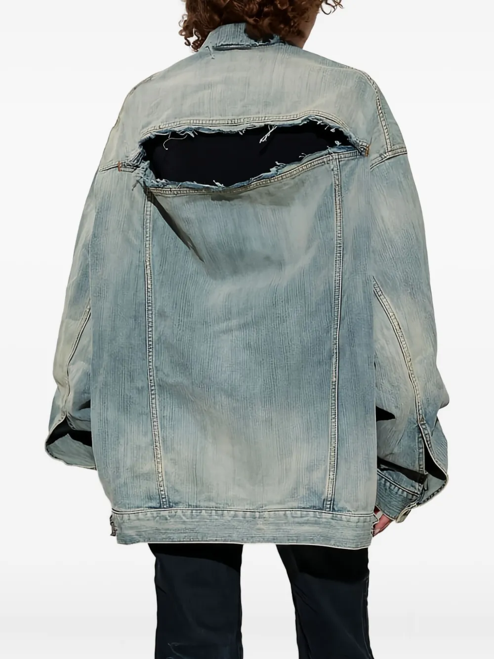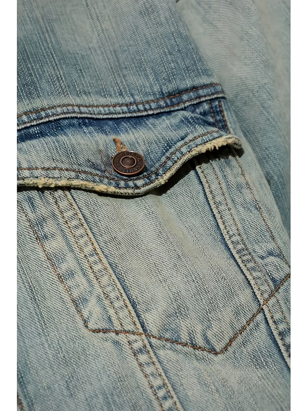 Синий цвет, потертости, застегивается на пуговицы, клапаны на карманах, необработанные края, вырез на спинке