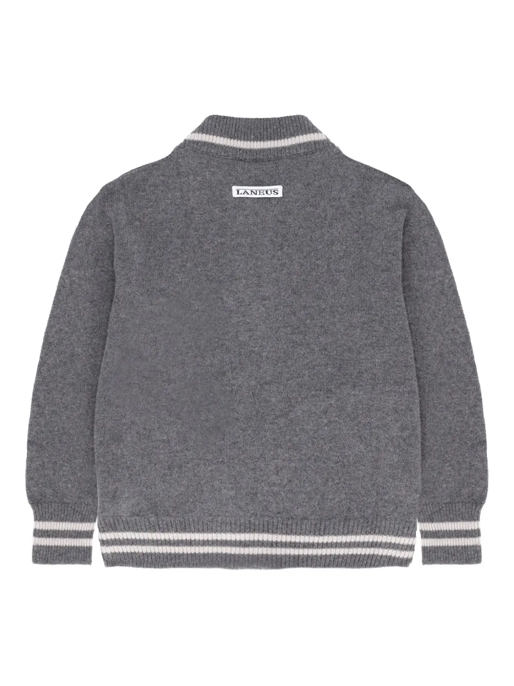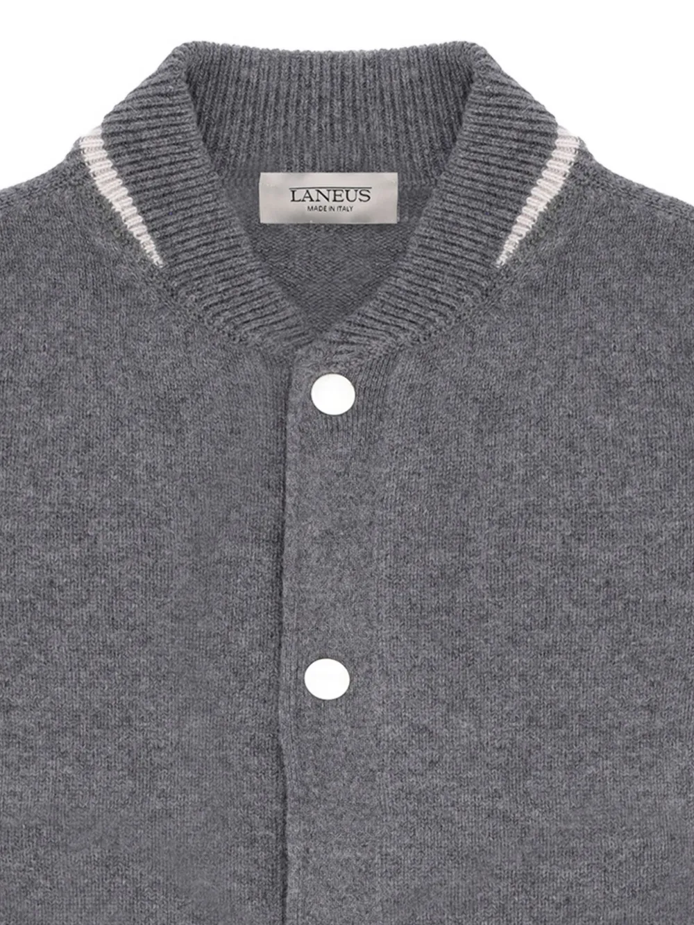 Серый трикотажный материал, застежка на пуговицы, ребристый низ, ребристые манжеты, боковые карманы