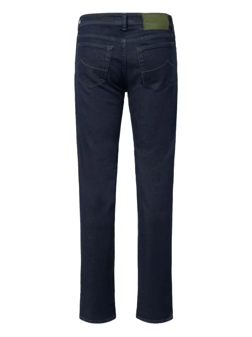 Темно-синий, пять карманов, застежка на пуговицах, шлевки для ремня, кожаная нашивка, прямые брючины