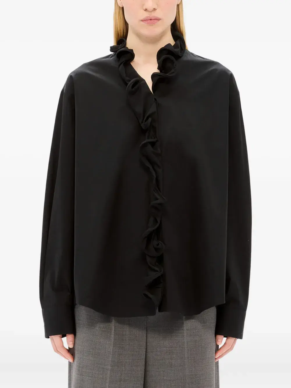 Черный оборчатый воротник длинные рукава застежка на пуговицы спереди свободный крой закругленный подол