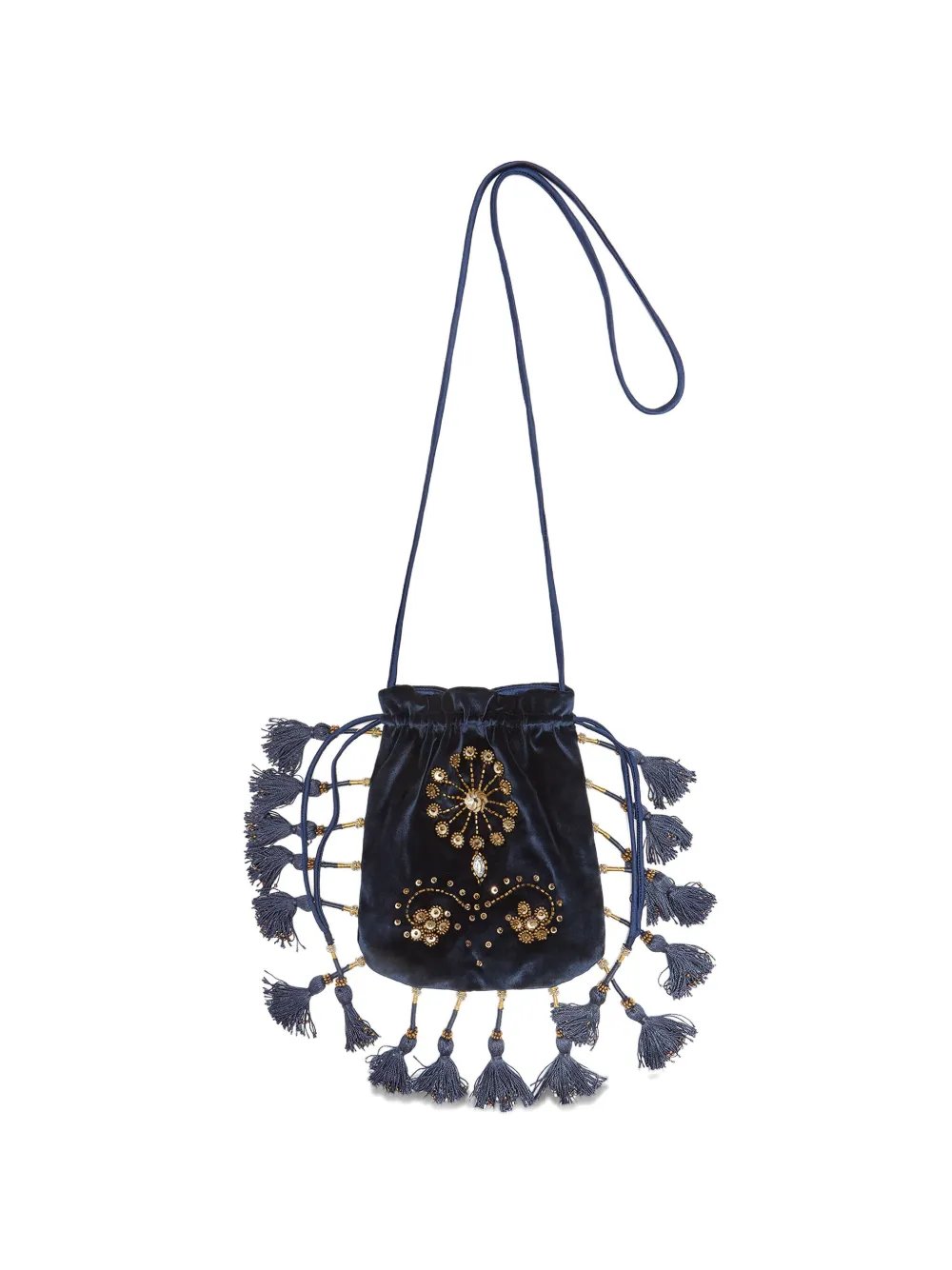 Темно-синий бархат, отделка бисером, детали с кисточками, застежка на шнурке, плечевой ремень