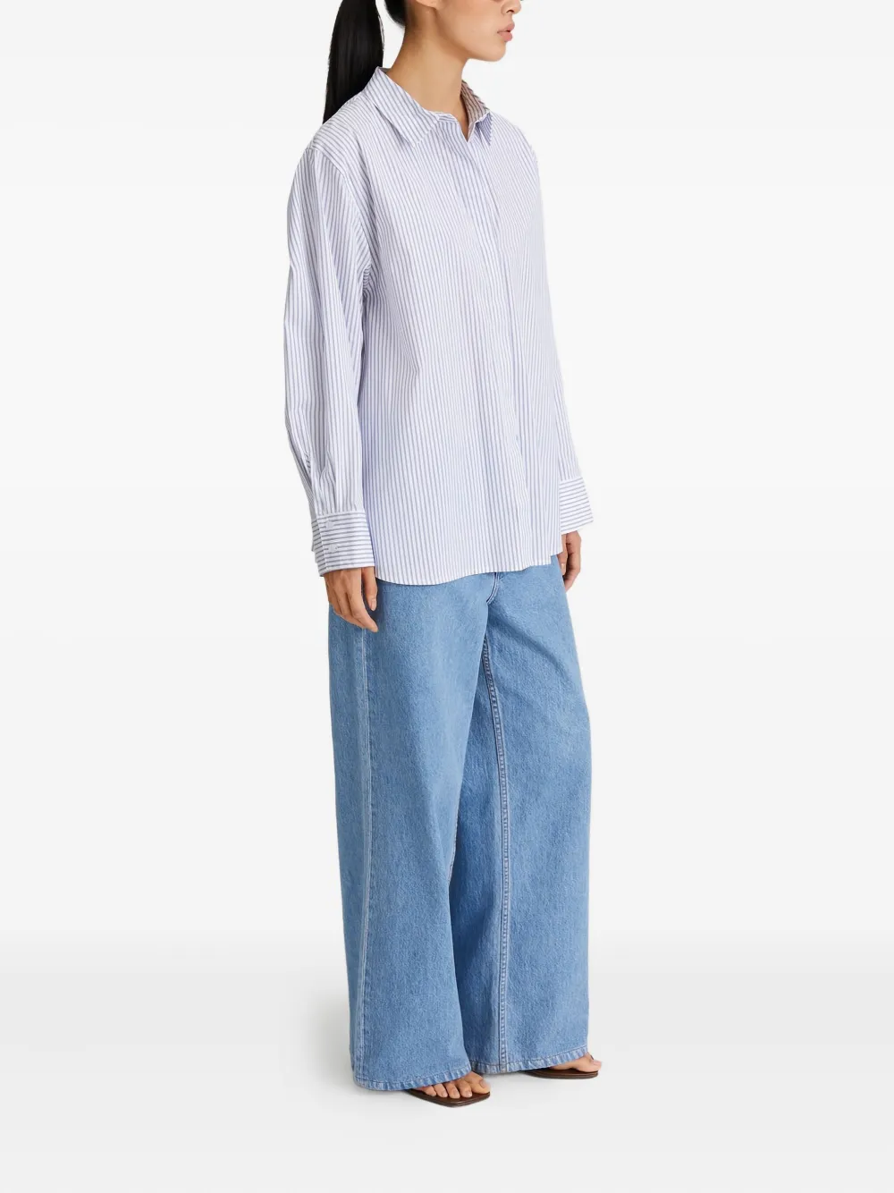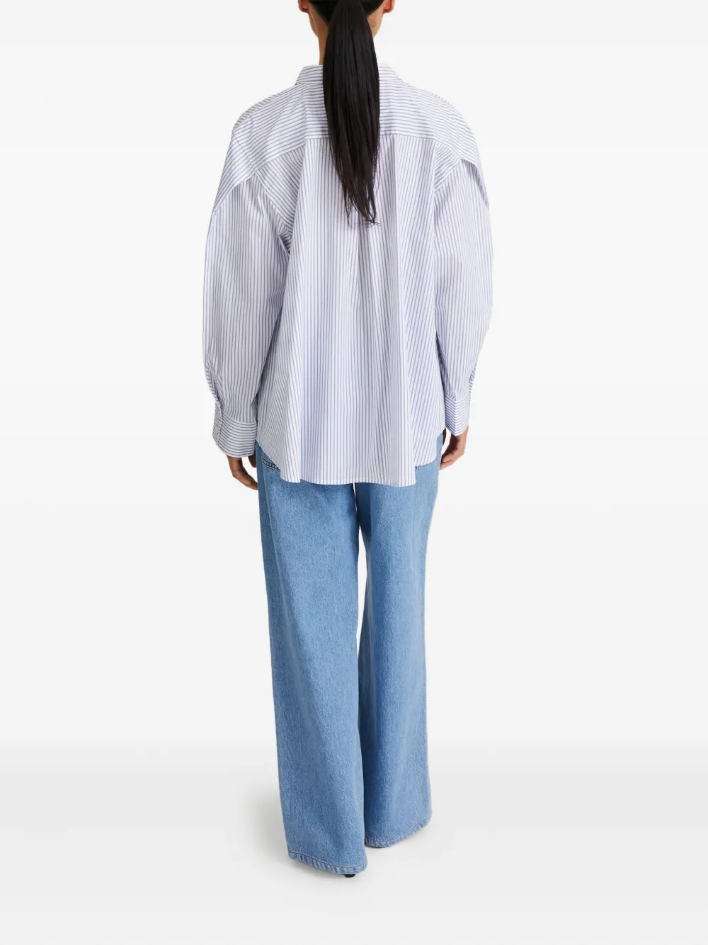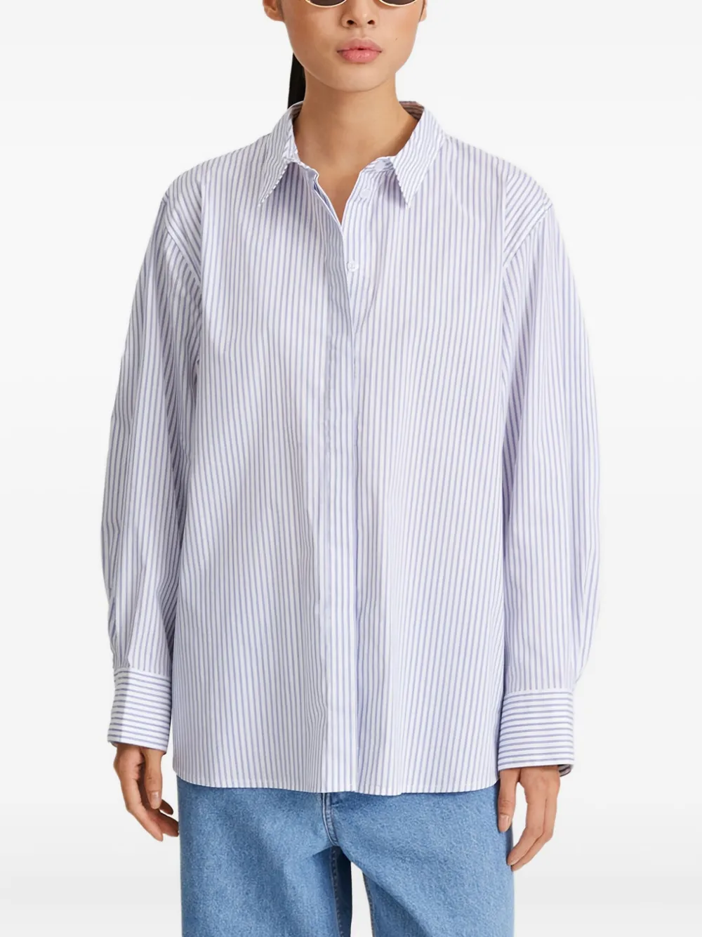Белая и синяя рубашка в полоску с длинными рукавами, отложным воротником, застежкой на пуговицы, свободного кроя