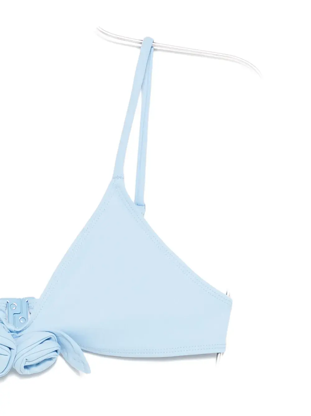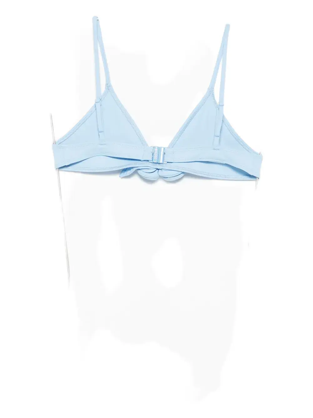 Светло-голубой, ребристая текстура, треугольная форма, регулируемые бретели, бантик спереди, застежка сзади. Пожалуйста, примерьте купальник поверх собственного белья.