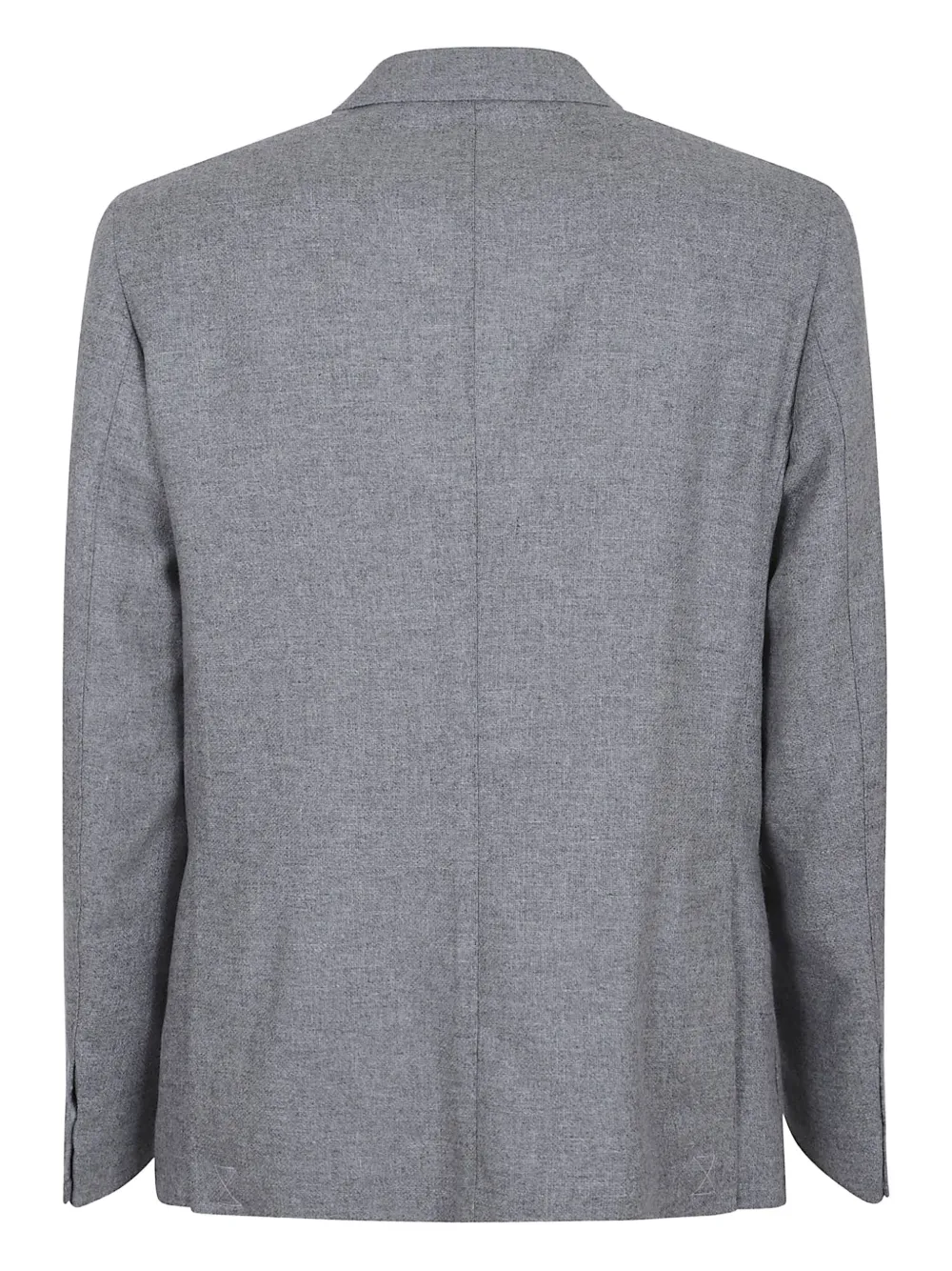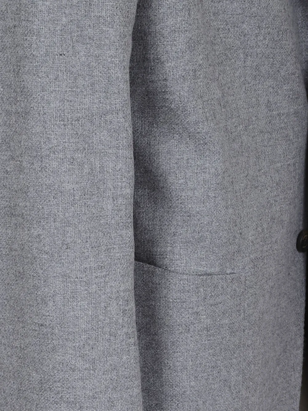 Серый, застегивается на пуговицы, накладные карманы, лацканы с острыми концами, закругленный низ, длинные рукава