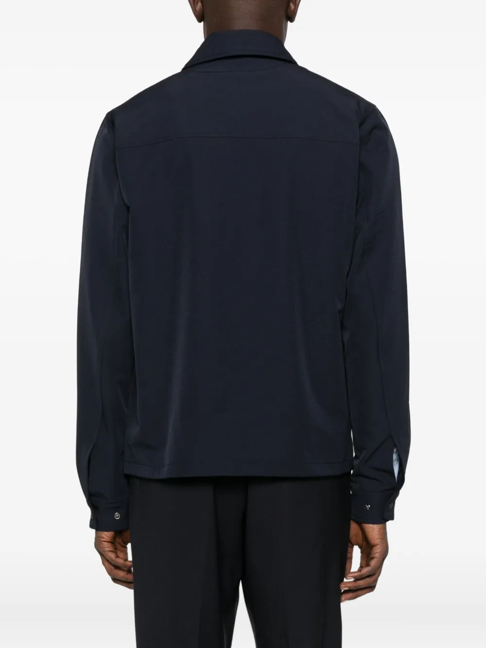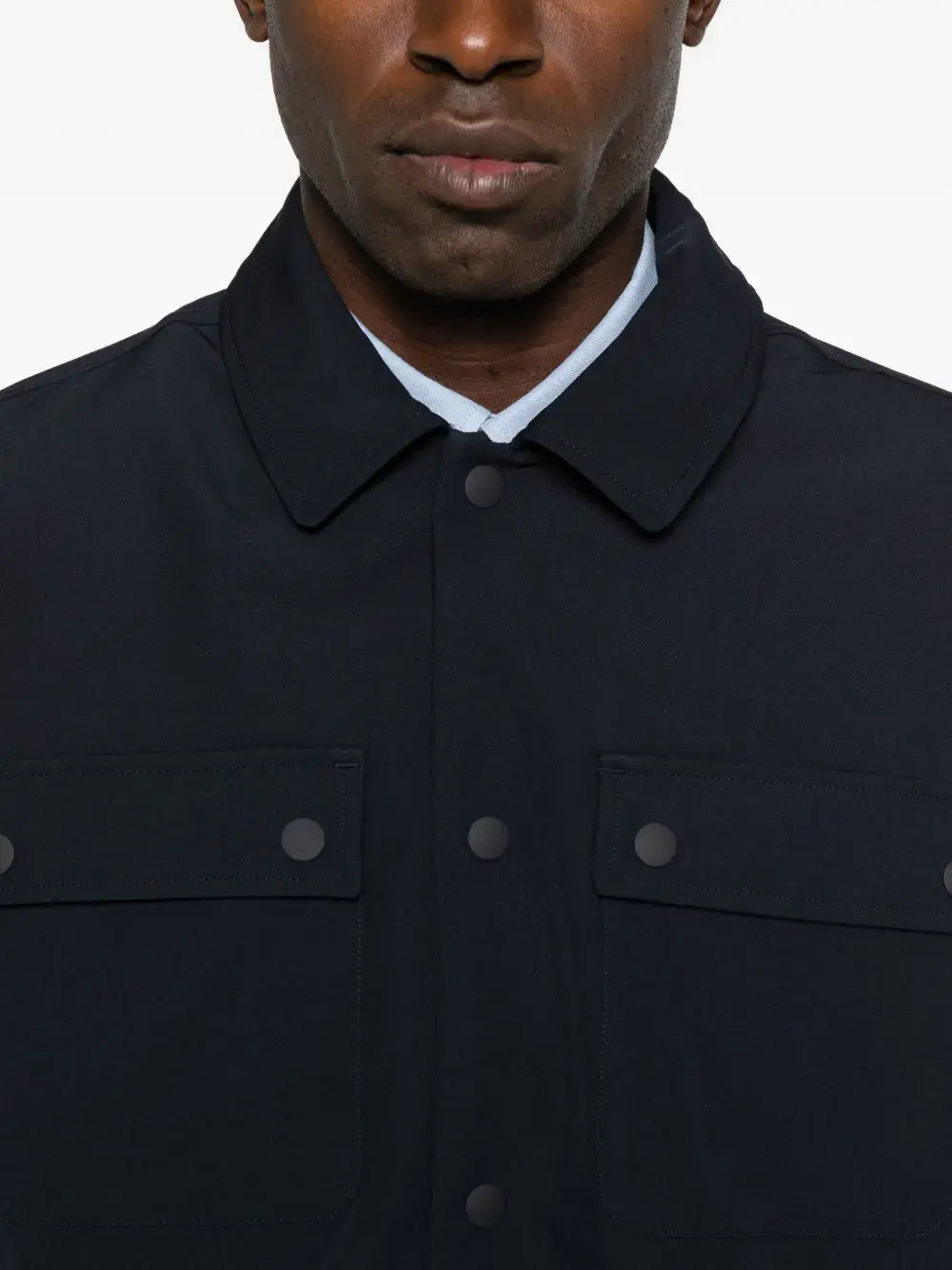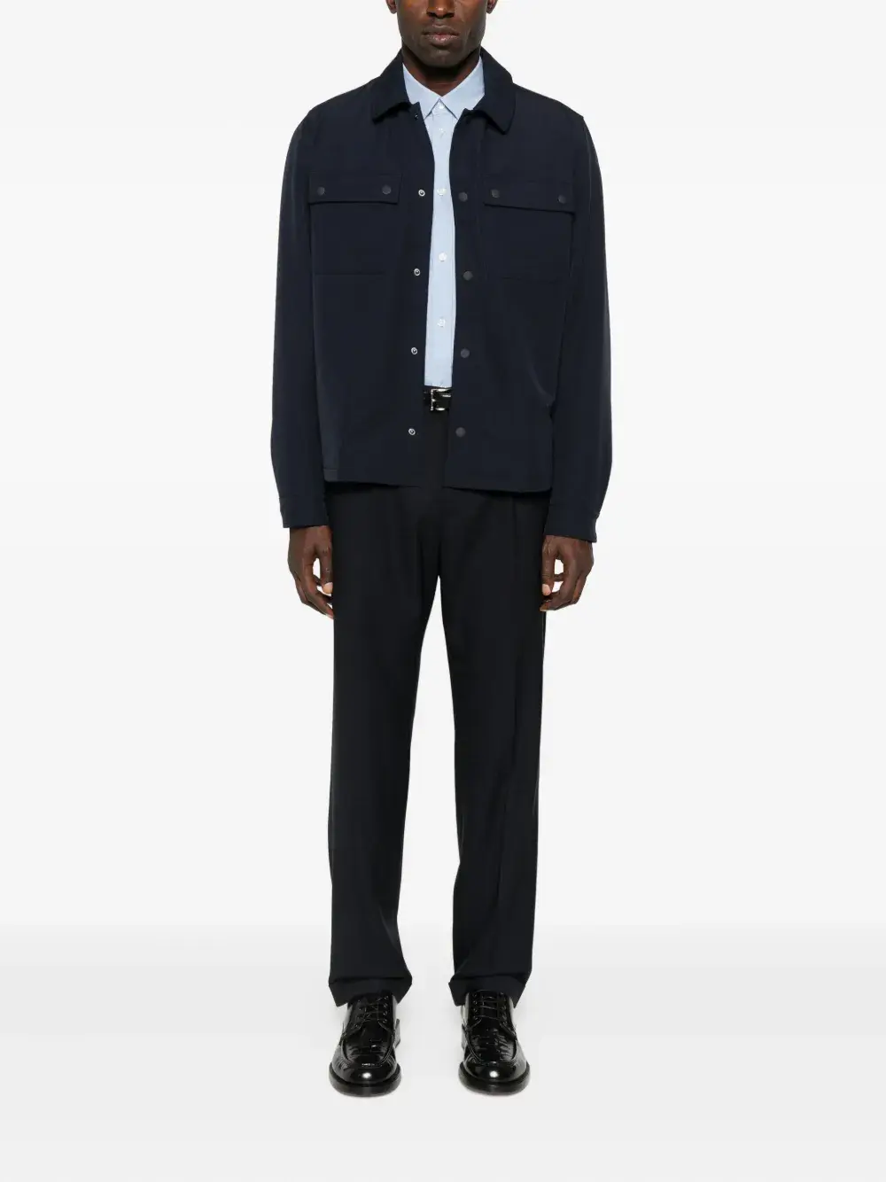 Темно-синий застежка на кнопки спереди двойные накладные карманы классический воротник длинные рукава прямой край
