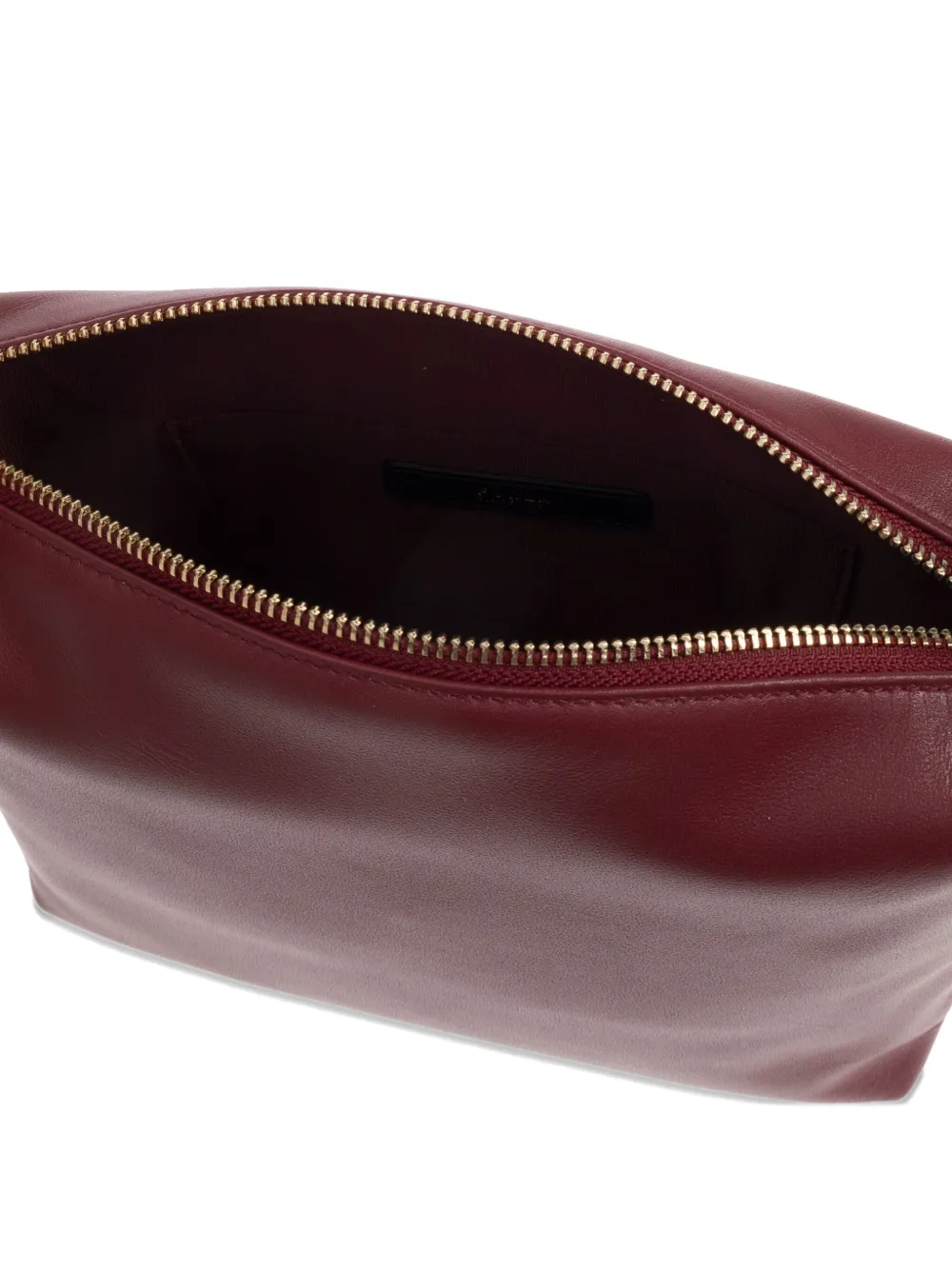 Бордовая кожа, конструкция, застежка-молния сверху, съемный плечевой ремень, фурнитура золотистого цвета, ненавязчивый брендинг