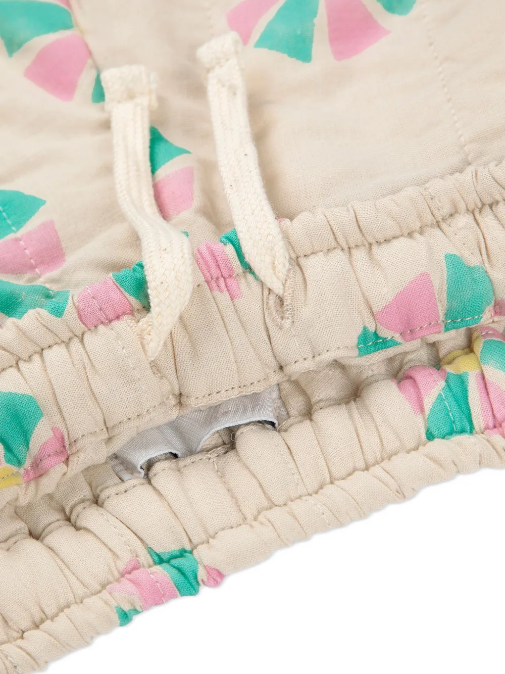 - сливочно-белый цвет - цветочный принт - эластичный пояс - застежка на завязке - накладной карман