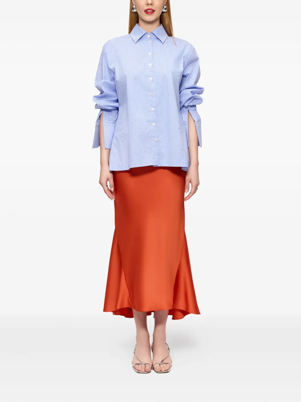 Светло-голубые тонкие полоски, украшения из кристаллов, застежка на пуговицы, длинные рукава, присборенные манжеты