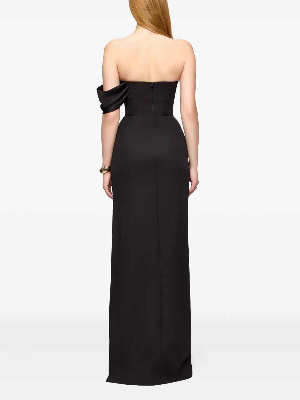 Черное платье с открытым плечом, без бретелек, в пол, с разрезом сбоку