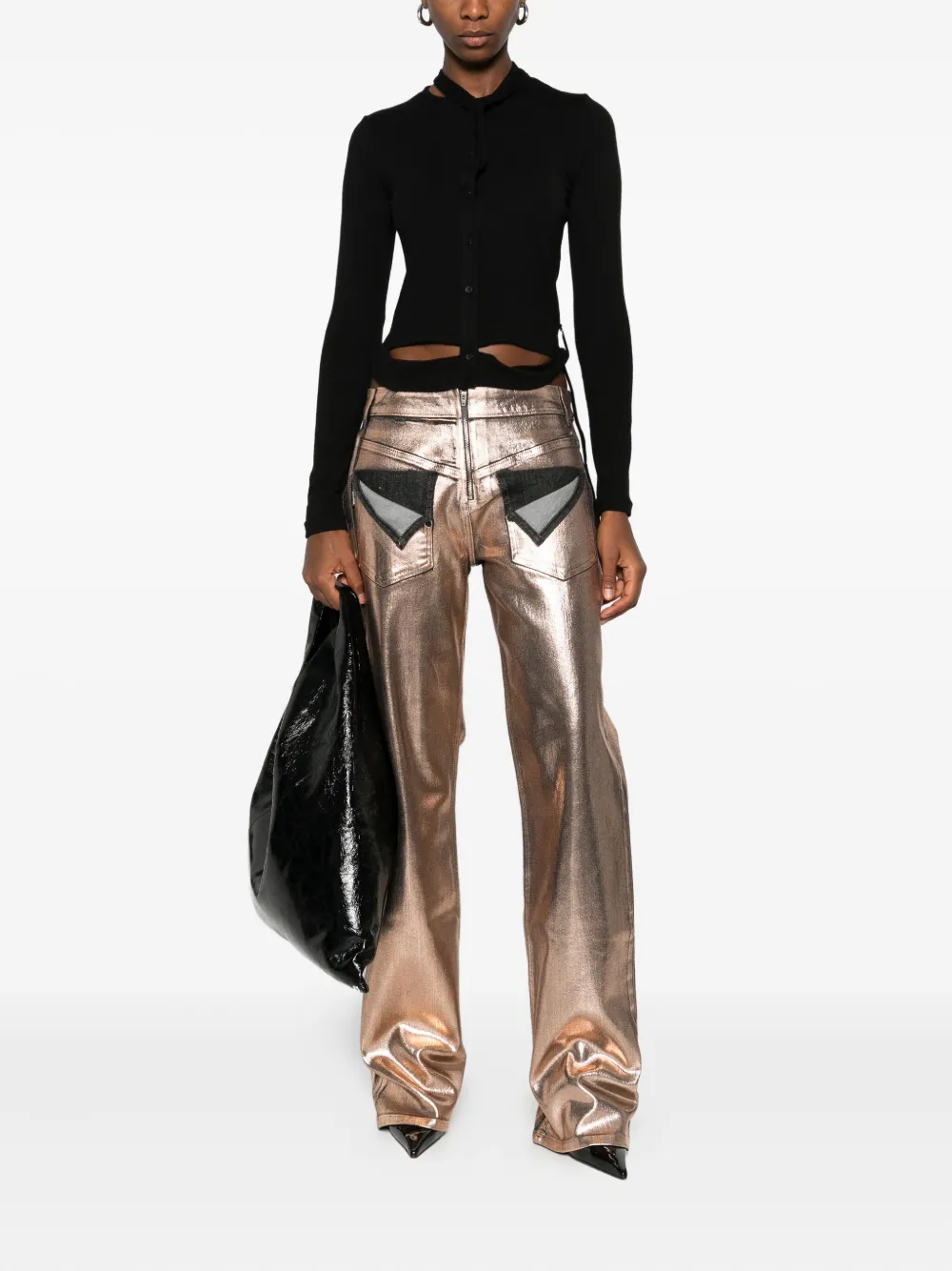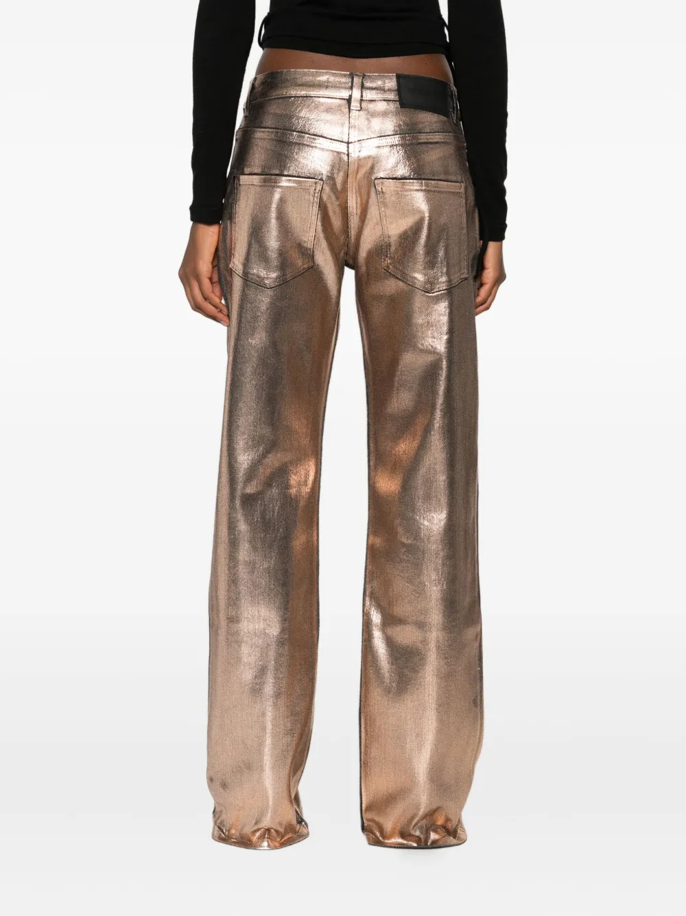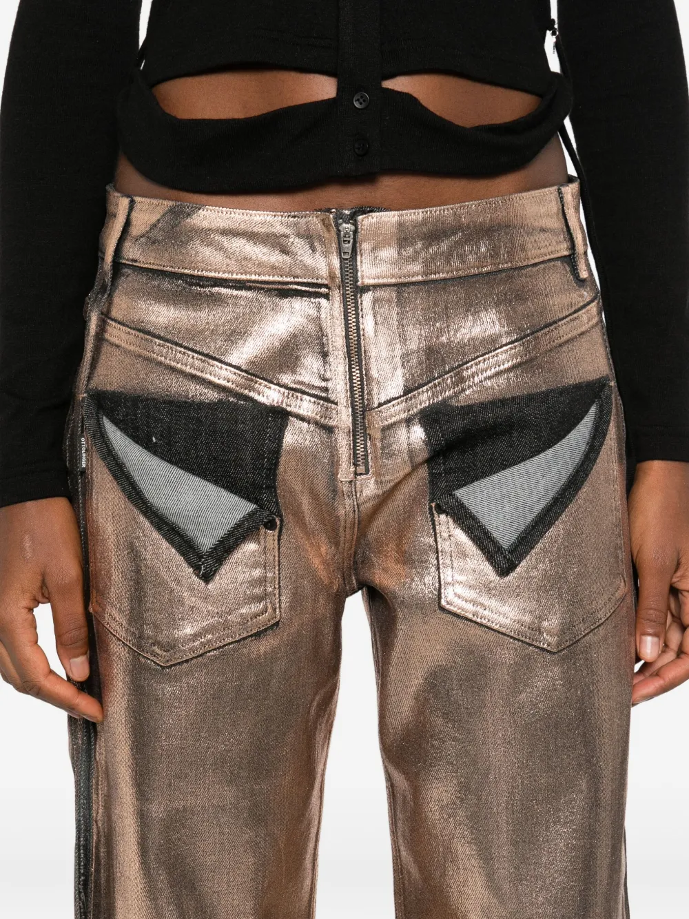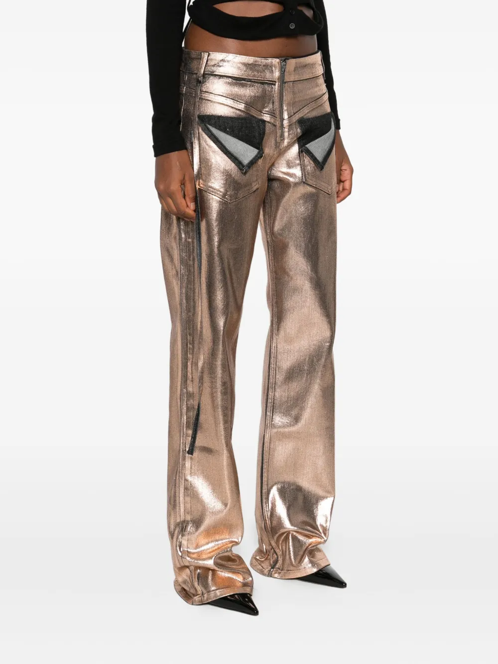 Розово-золотистый оттенок металлический блеск контрастные вставки застежка-молния деталь бокового шва прямые брючины